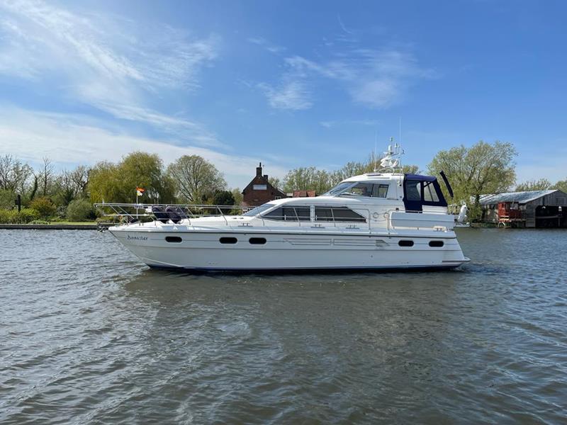 BROOM 44 – 1992 – 2x Caterpillar 3208 TA 435hp diesel engines. 6-berth accommodation, featuring a capacious aft cabin, 2 comfortable forward cabins and 2 toilet and shower compartments. Enviable specification includes; bow and stern thrusters with remote,  holding tank, Victron 100A battery charger, Paguro generator, Victron 3000w inverter, 240v shore power, immersion heater, calorifier, Zanussi washing machine, AIS receiver, new Silvertex cockpit upholstery, Webasto 5kw heater, electric towel rails, life raft, Lofrans electric windlass, trim tabs and a range of navigation equipment. New canopy 2021. A very tidy Broom  44 with Caterpillar V8 turbo diesels for enhanced performance, as well as many recent upgrades and improvements for a more comfortable experience. An excellent choice for offshore cruising – early viewing recommended!