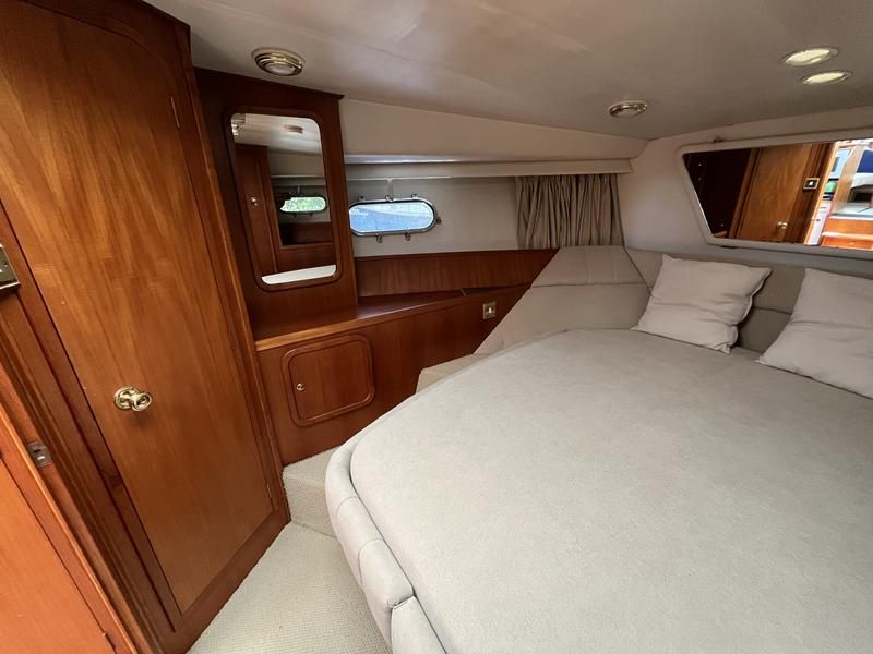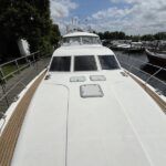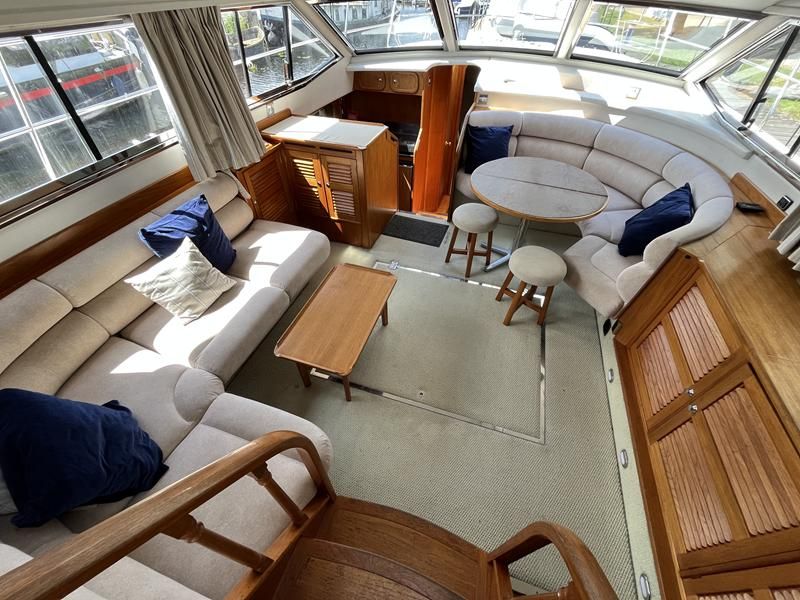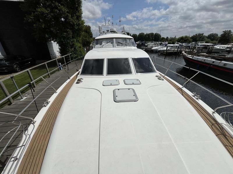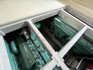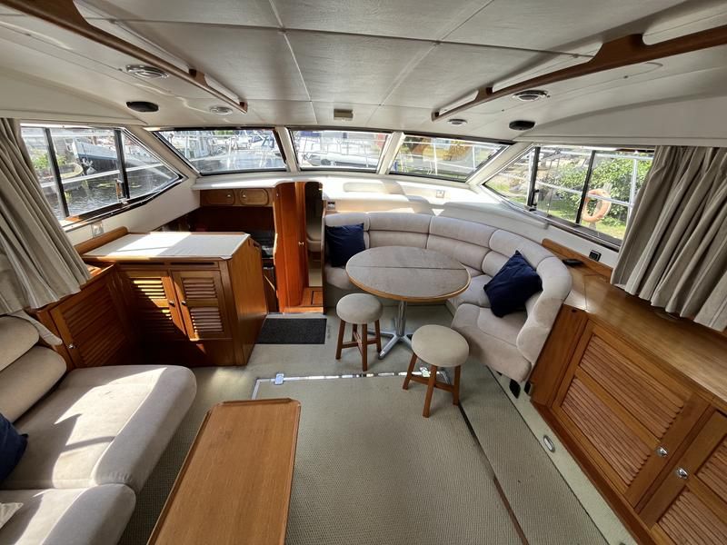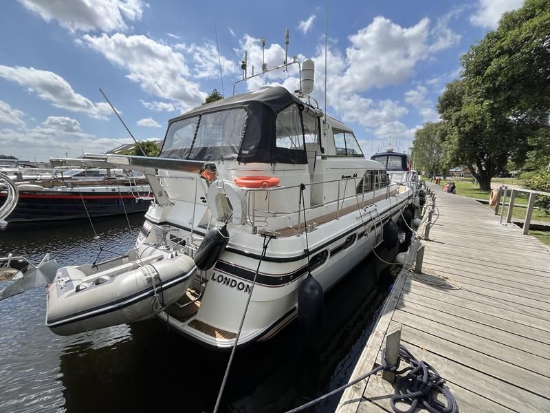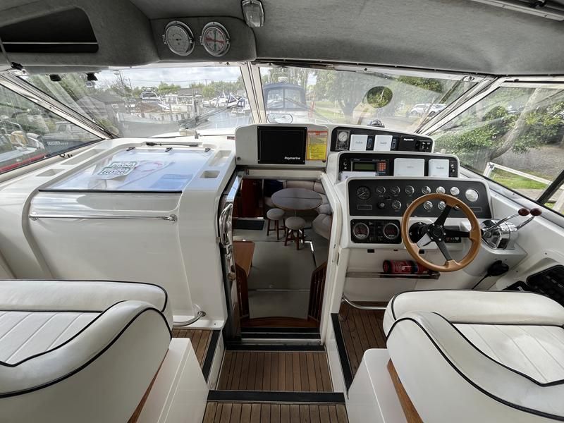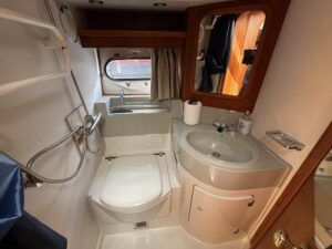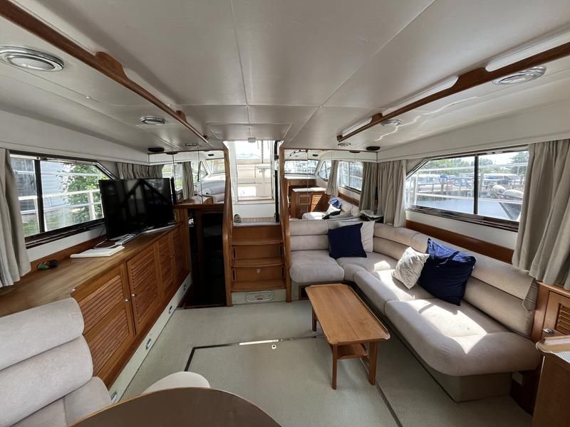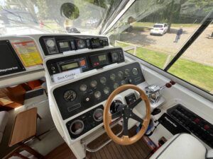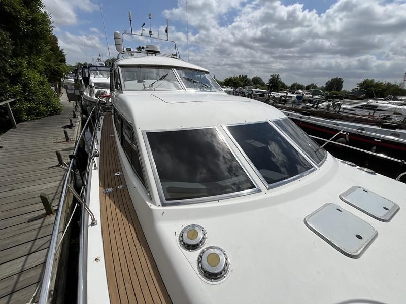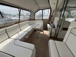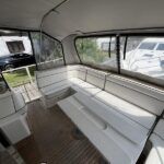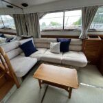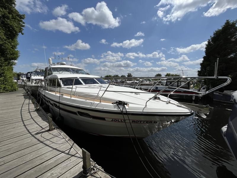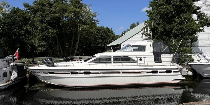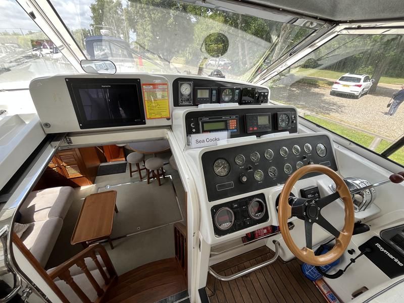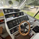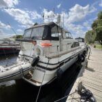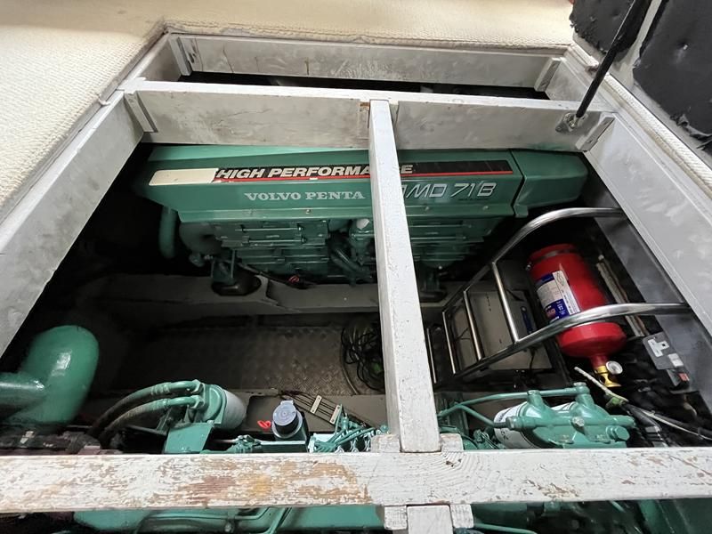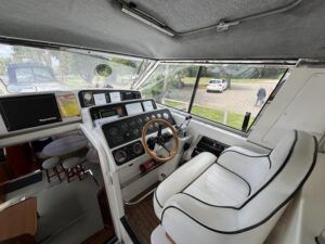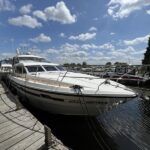 Broom 44 – 1992 – 2 x Volvo Penta TAMD71B 380HP diesel engines. Spacious 6 berth accommodation in 3 cabins with two electric toilets and showers. Well specified including; Bow thruster, warm air heating, air-con, shore power, battery charger, Raymarine Axiom, Quantum radar, washing machine, davits, trim tabs, hydraulic steering, holding tank and much more. Antifouled and serviced 2024. A sought after Hardtop version of the Broom 44, a truly spacious, and comfortable family cruiser with excellent sea-keeping capabilities.
