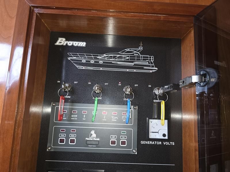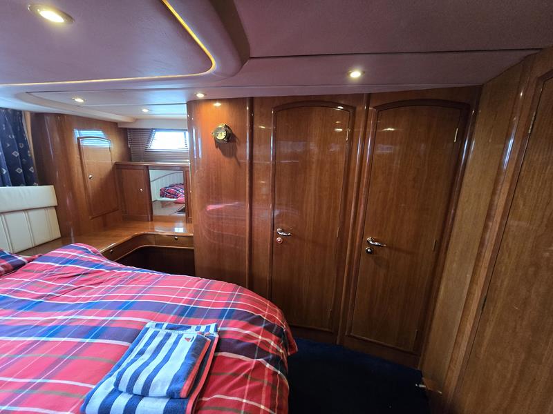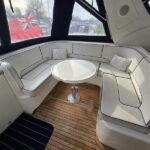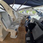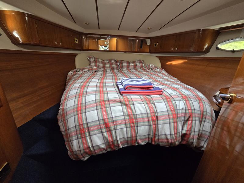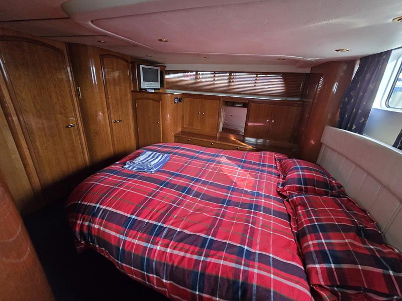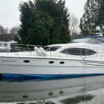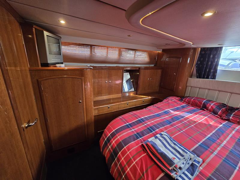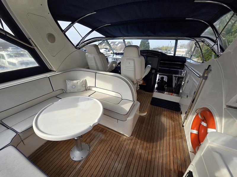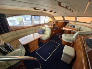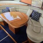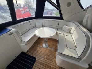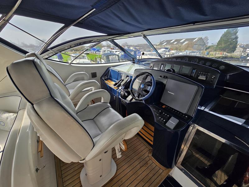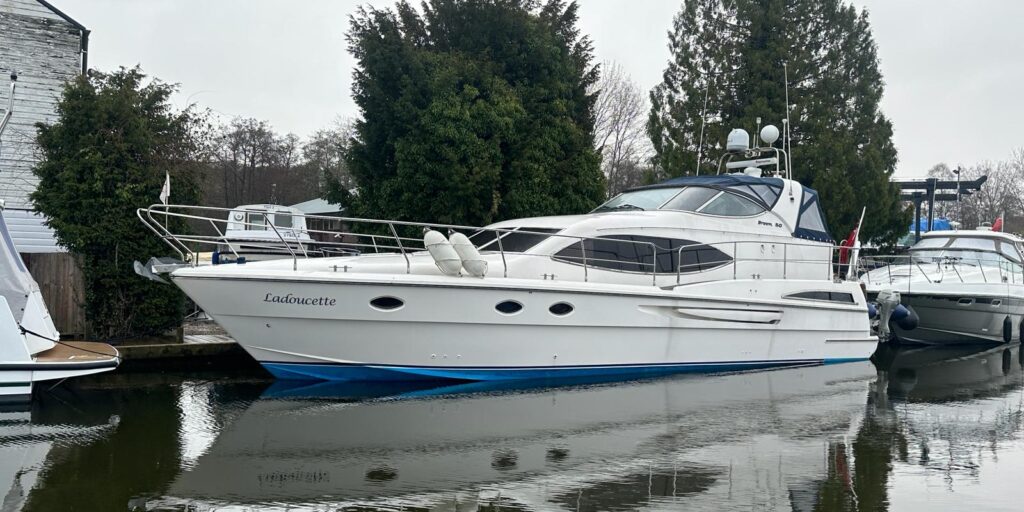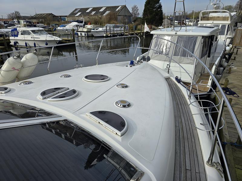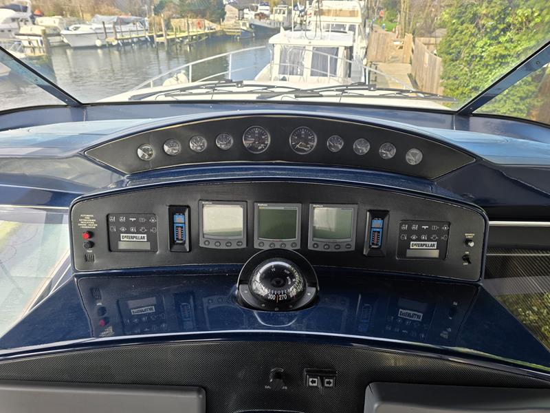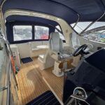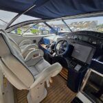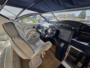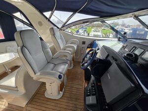 Broom 50 – 2002 – 2 x Caterpillar 3196 660hp engines, 6 berths across 3 cabins, 2 x toilet and shower compartments, Beautifully finished in high gloss cherry. Bristling with extras that include – air con, heating, bow thruster, track vision satellite TV, cockpit BBQ and drinks fridge, 11.9Kw generator, Raymarine plotter/radar/autopilot/VHF. Boasting vast accommodation typical of larger boats and low engine hours! The Broom 50 is a fast and very capable offshore cruiser.