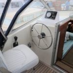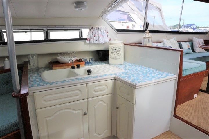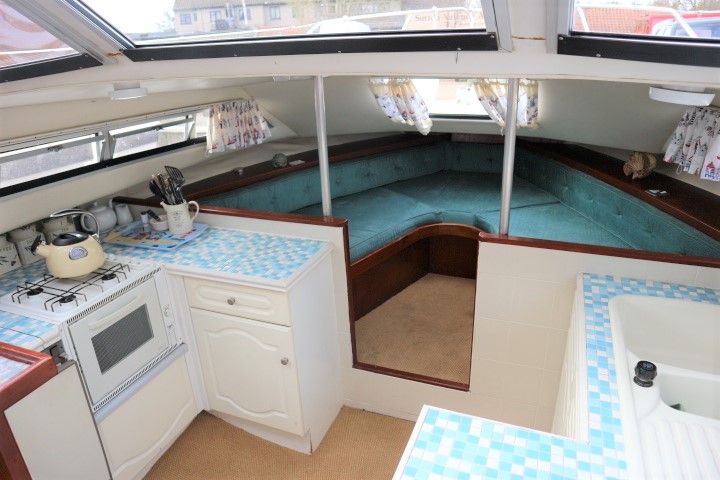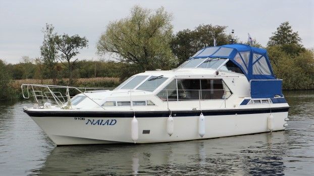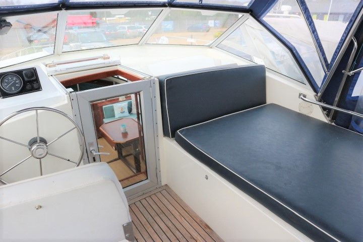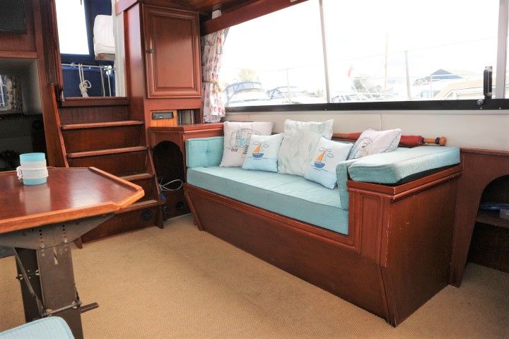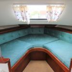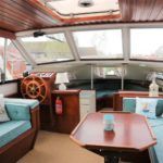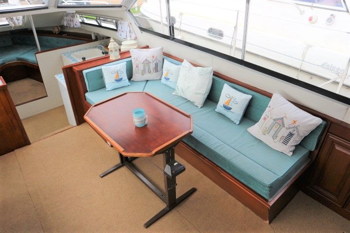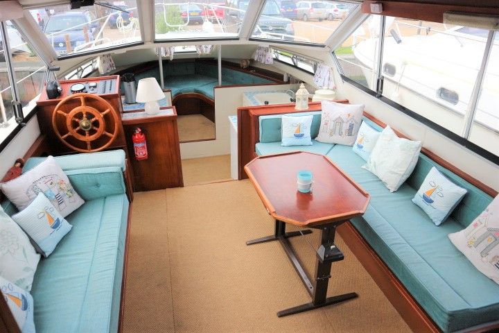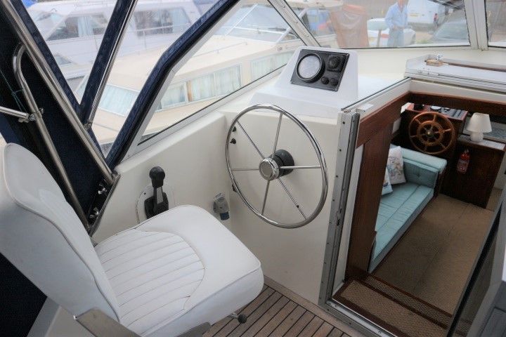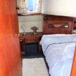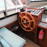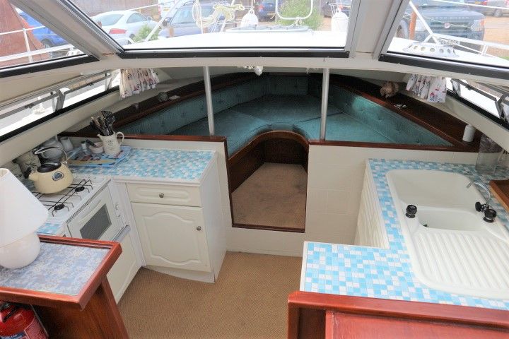 AQUAFIBRE 32 SAPPHIRE – 1989 – (Fitted by East Midlands Boat Services) Single Ford Mermaid 130hp diesel engine. 5 berth accommodation with 1 x toilet/shower compartment. Single cabin layout with an open plan Saloon and forward cabin. Spec including Shore power, battery charger, warm air heating, teak laid aft deck, full canopy, dual steering, BSC 07/20. A unique example offering spacious living areas and an upgraded engine, making her a capable cruiser.