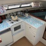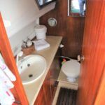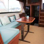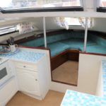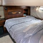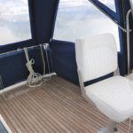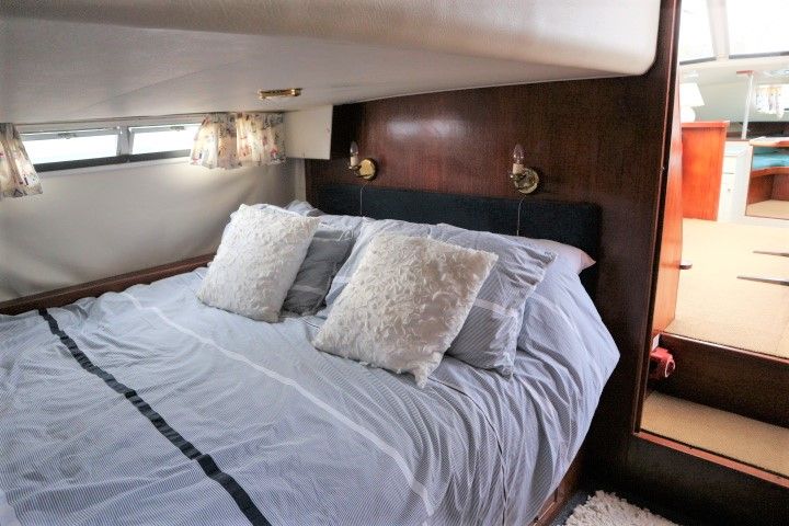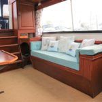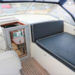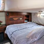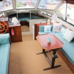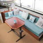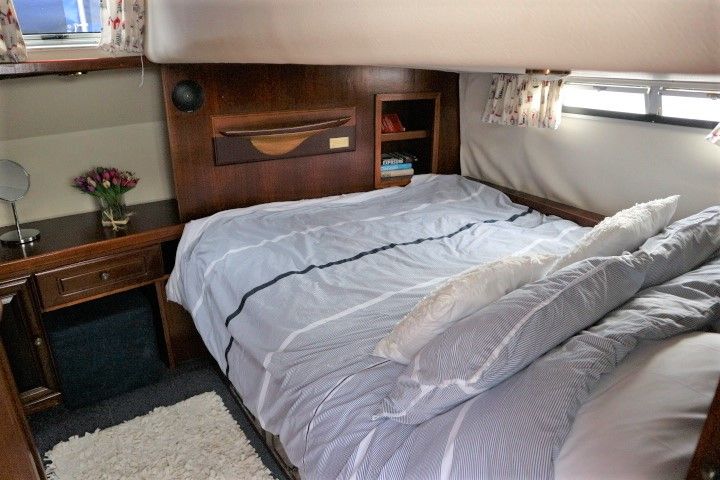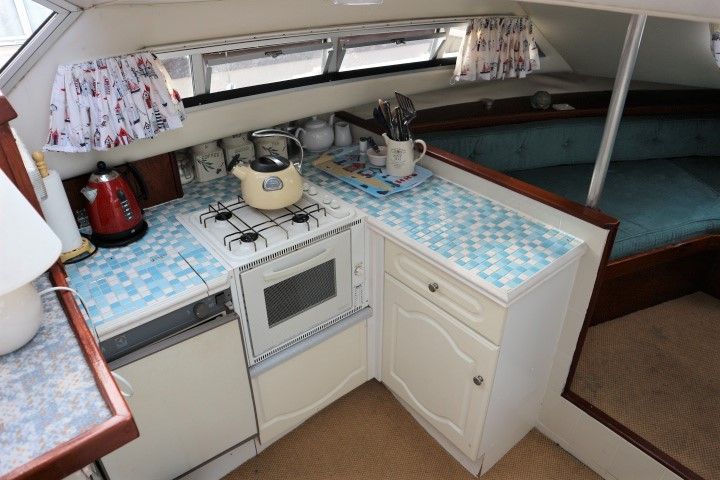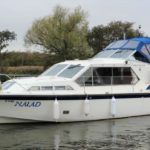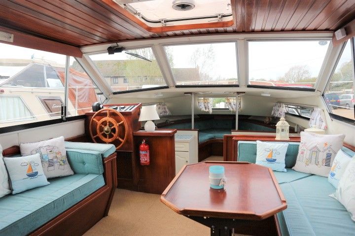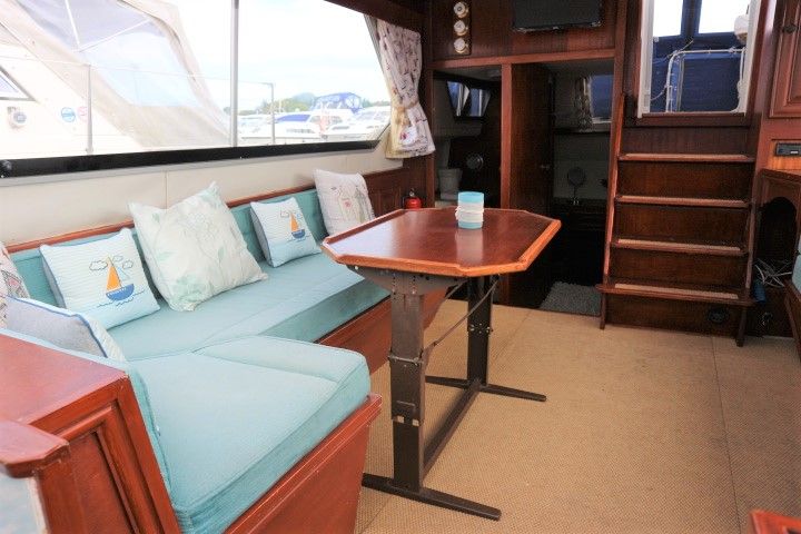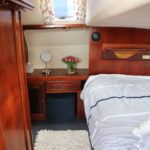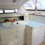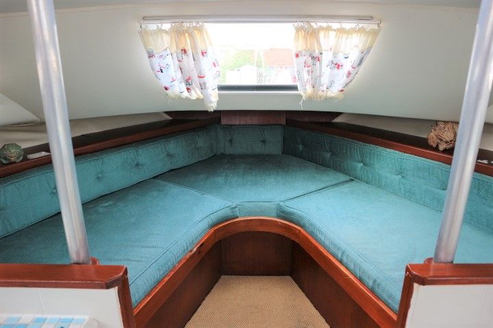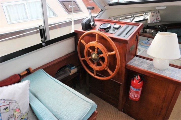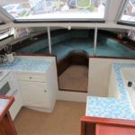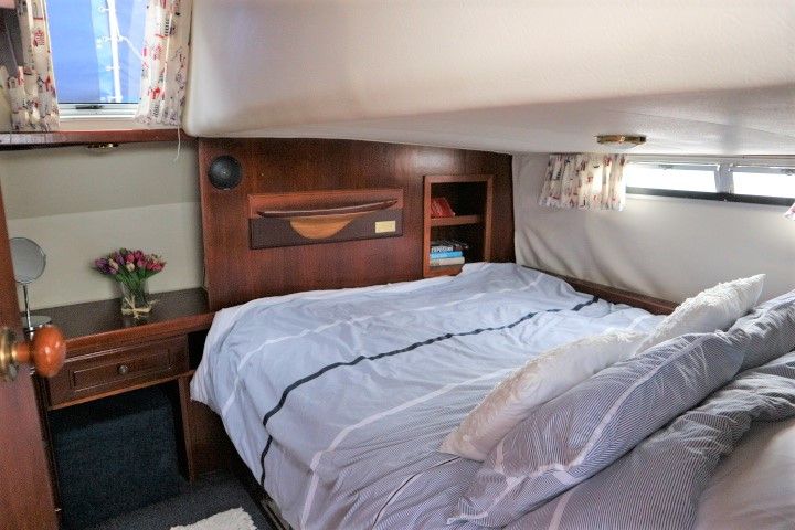AQUAFIBRE 32 SAPPHIRE – 1989 – (Fitted by East Midlands Boat Services) Single Ford Mermaid 130hp diesel engine. 5 berth accommodation with 1 x toilet/shower compartment. Single cabin layout with an open plan Saloon and forward cabin. Spec including Shore power, battery charger, warm air heating, teak laid aft deck, full canopy, dual steering, BSC 07/20. A unique example offering spacious living areas and an upgraded engine, making her a capable cruiser.