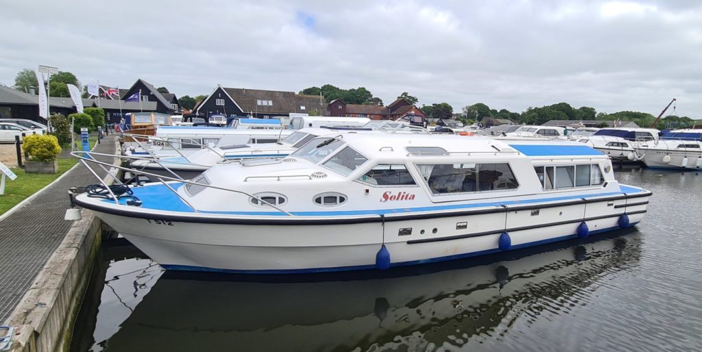 Broom Aquafibre 35 Diamond – 1993 – Powered by a single Perkins MC42 diesel engine through a shaft drive. 4/5 berth accommodation with 2 toilets/showers. Specification to include; bow thruster, Webasto heating, immersion heater, shore power, inverter and battery charger. A nice example, perfectly designed for cruising the Broads. BSC 16/04/2027