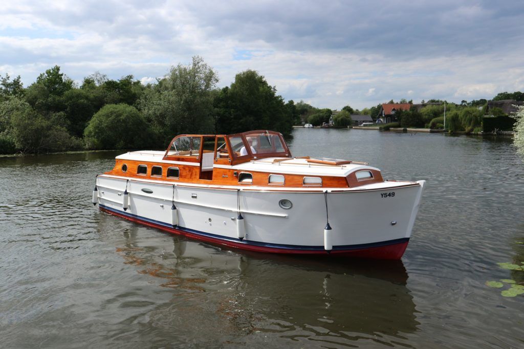 BROOM CAPTAIN – 1957 – Nanni N4.65 diesel engine. Extensively updated and renovated to a exceptionally high standard, over a number of years by her fastidious owner. 4 berth accommodation with double berth in master forward cabin convertible saloon berths. Many modern features, beautifully fitted & well equipped galley with marble stone worksurfaces. Re engined in 2018, specification including battery charger, inverter, shore power, Warm air heating, leather saloon upholstery and much more…. A turn key classic, viewing a must.