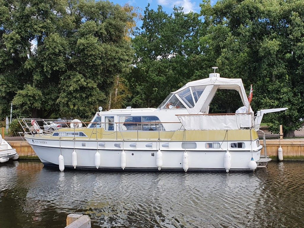 BROOM CONTINENTAL 37 – Circa 1976 – Powered by twin Perkins HT6.354 145hp diesels through shafts – 6 berth accommodation with two toilets and two showers. Specification to include; Eberspacher D4 warm air heating (new 2020), holding tank, trim tabs, shore power, battery charger, Garmin GPSmap 750s, VHF. Anodes and antifoul 2019. New synthetic teak to aft deck 2018. A very nice example presented in very good order throughout! Ideal for extended cruising and time aboard! Excellent sea handling capability and renowned Broom pedigree.