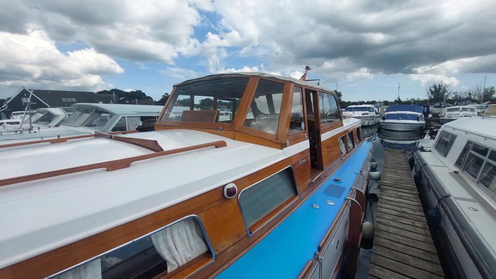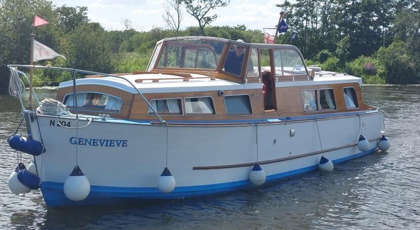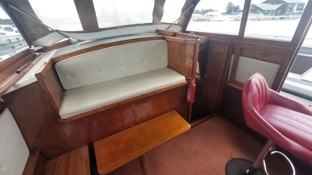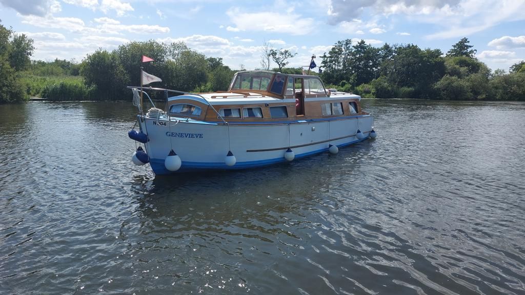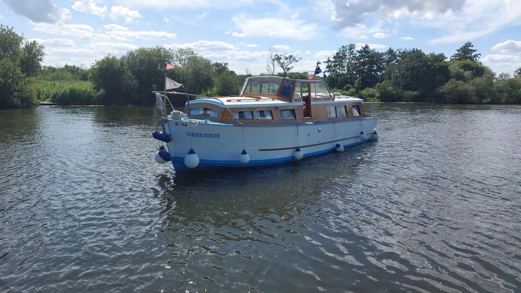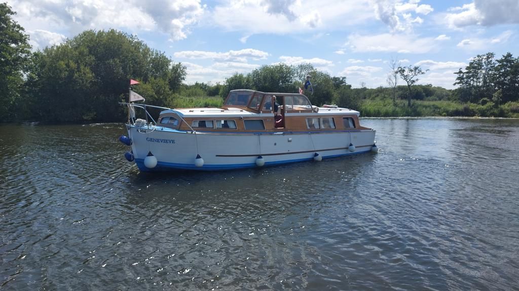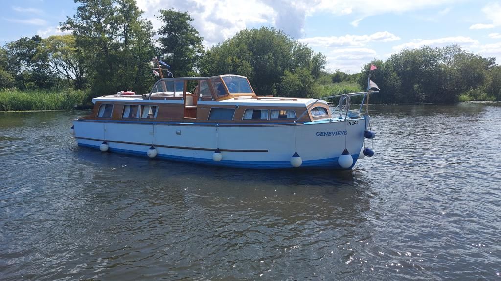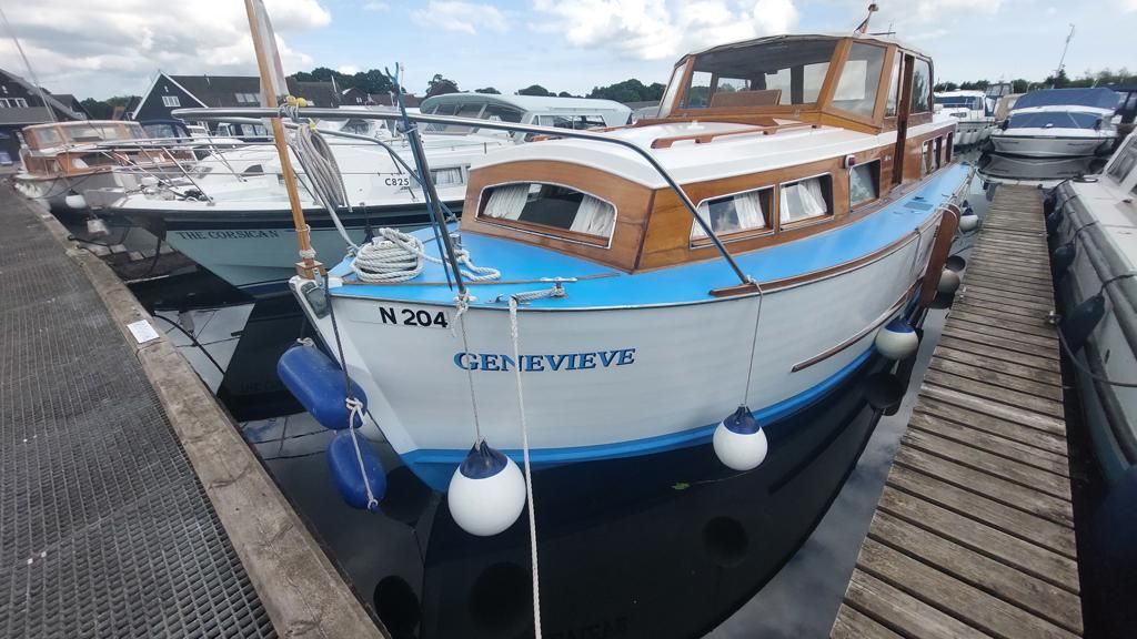 Broom Navigator – Circa 1968 – Single BMC 2.2ltr Commander 50hp diesel engine through a shaft. 4 berth accommodation across 2 cabins with separate toilet and shower compartments. Specification to include; warm air heating, navigation lights, aft well canopy, folding wheelhouse screens. An elegant, traditional Broom motor cruiser of the late 196o’s, “Genevieve” has been cossetted inside and out by her current owner and has spent much of her recent life in a wet-shed. A classic craft, perfectly at home on the Norfolk Broads and an ideal boat on which to spend holidays or extended stays afloat.