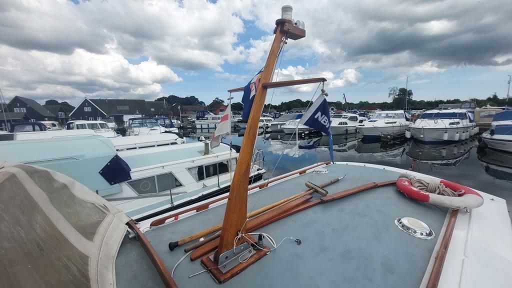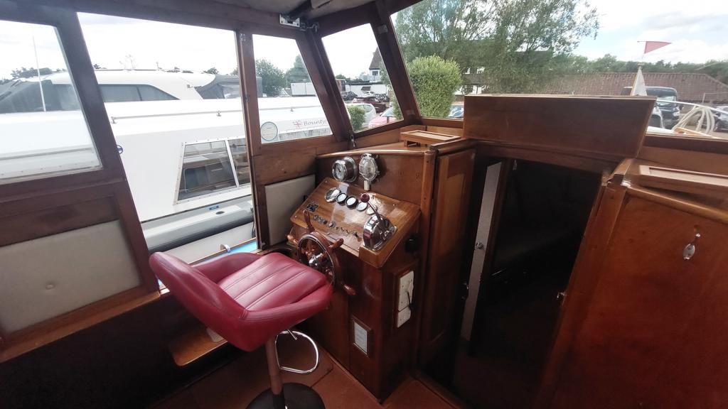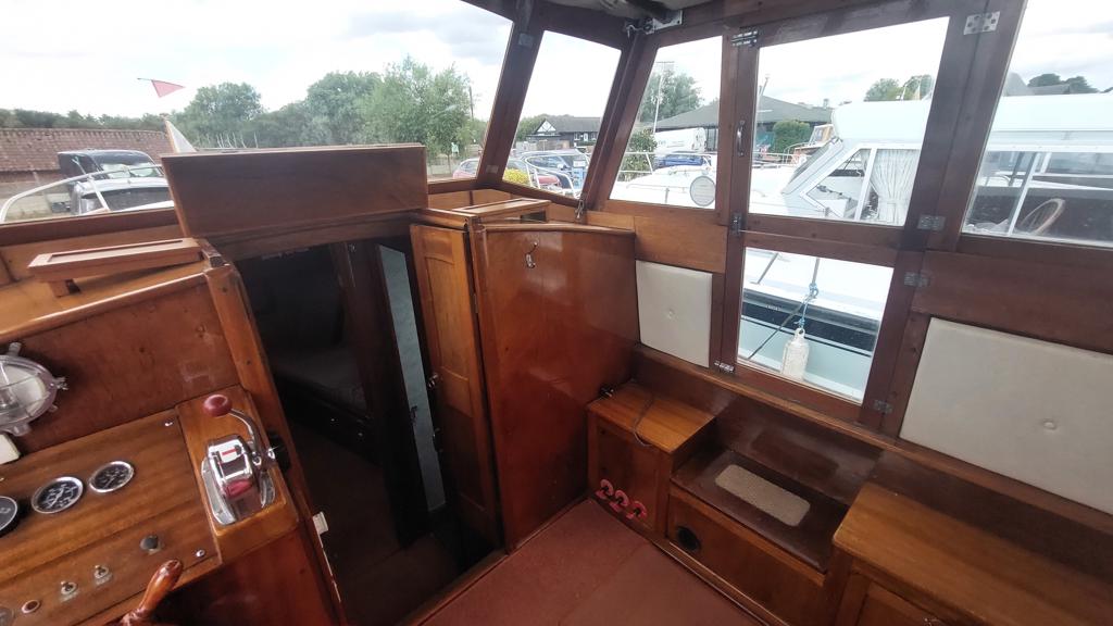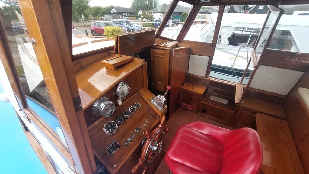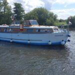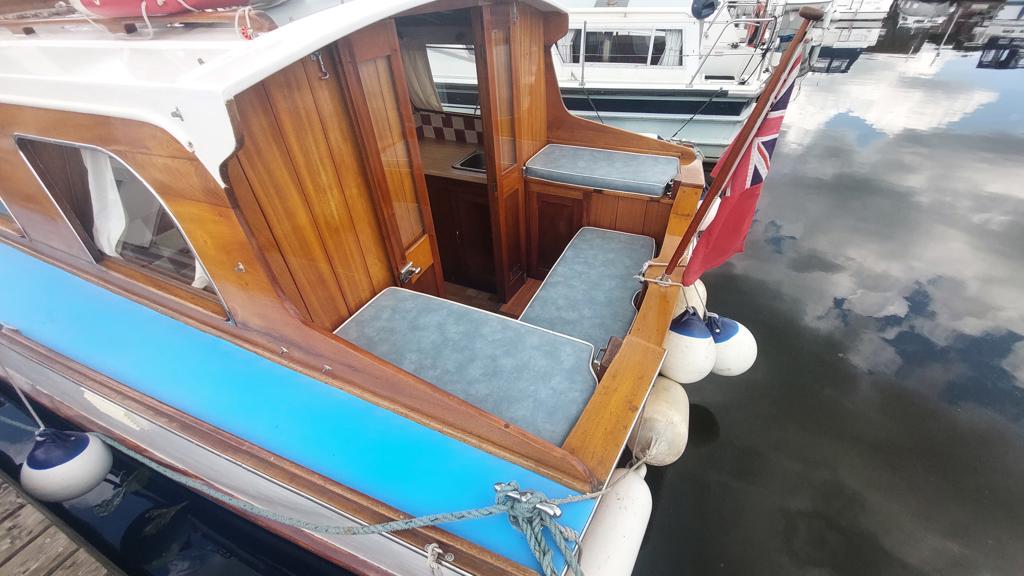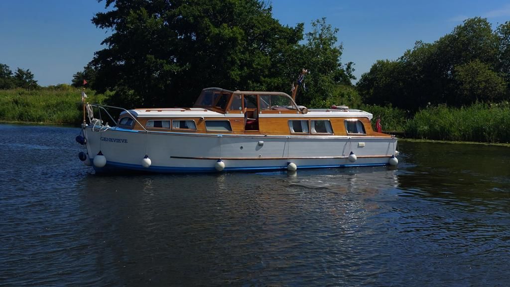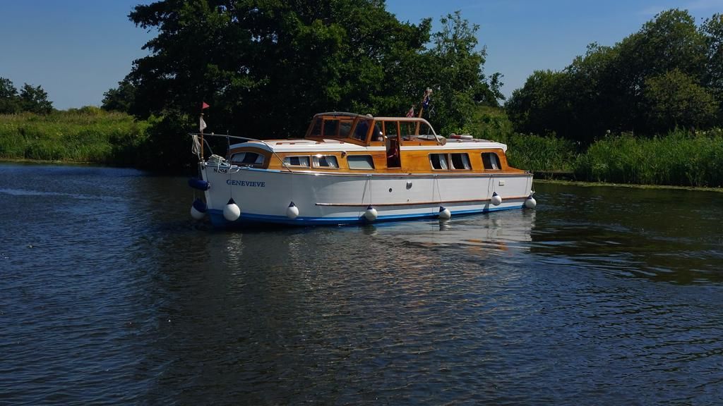 Broom Navigator – Circa 1968 – Single BMC 2.2ltr Commander 50hp diesel engine through a shaft. 4 berth accommodation across 2 cabins with separate toilet and shower compartments. Specification to include; warm air heating, navigation lights, aft well canopy, folding wheelhouse screens. An elegant, traditional Broom motor cruiser of the late 196o’s, “Genevieve” has been cossetted inside and out by her current owner and has spent much of her recent life in a wet-shed. A classic craft, perfectly at home on the Norfolk Broads and an ideal boat on which to spend holidays or extended stays afloat.