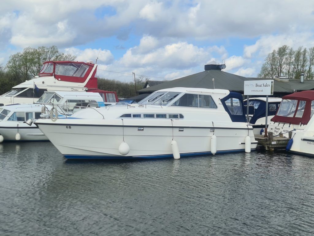 Broom Ocean 29 – 1995 with a Nanni 4.220HE (50hp) diesel engine. 4 berths, toilet/ shower, galley. shore power, Vetus bow thruster, 1800w Inverter, electric winch, new upholstery, carpets and curtains 2020, engine serviced 2020, BSC 2022. Full compound and polish, antifoul 2021, new canopy 2020. This is an exceptionally good example!
