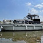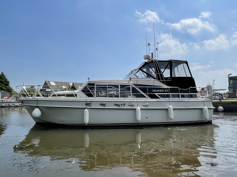BROOM OCEAN 37 – 1980 – Powered by twin Perkins HT6354 185hp diesels through shafts – 4 berth accommodation with two toilets and one shower – Specification to include; Warm air heating, trim tabs, electric windlass, holding tank, Raytheon SL70 radar, Autohelm tridata, shore power supply with 240v sockets and Victron charger. BSC 03/25. Folding radar arch and screens for increased inland access. Used to cruise the Broads for the last 3 years. A rare example with the later generation larger performance Perkins HT6354’s.