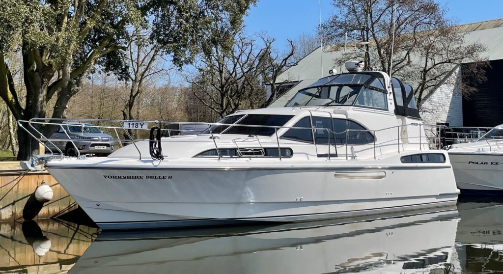 BROOM OCEAN 38 – 1999 – twin Yanmar 250hp diesels last service 2020 (inc. timing belts). 6 berth accommodation with two toilets and one shower. Good spec that includes; holding tank, bowthruster, warm air heating, inverter, Flexi teak laid cockpit and bathing platform. Recently updated Raymarine navigation equipment to include; Chart plotter, VHF, AIS, autopilot and radar scanner. Regularly serviced by the previous owner. Used to cruise the East Coast and across mainland Europe. NYA Stock fully prepared by our service centre. Presented in good order