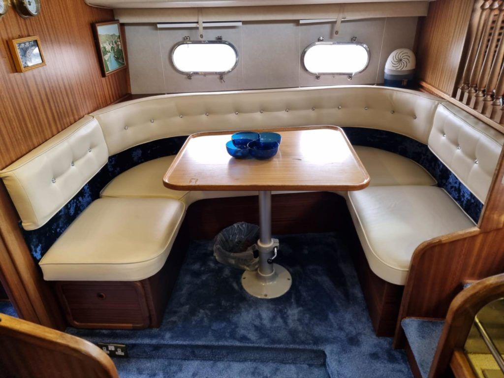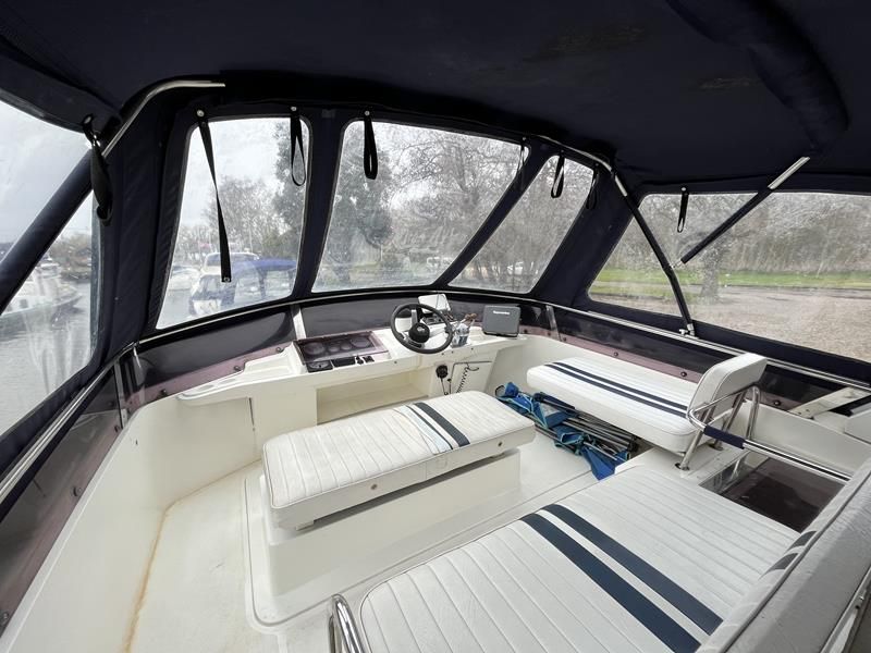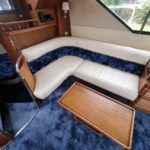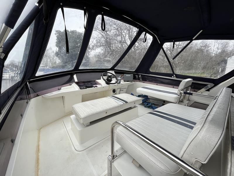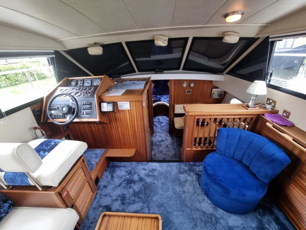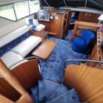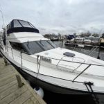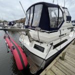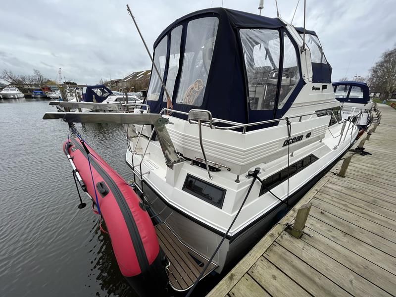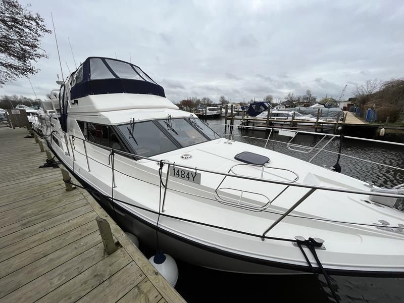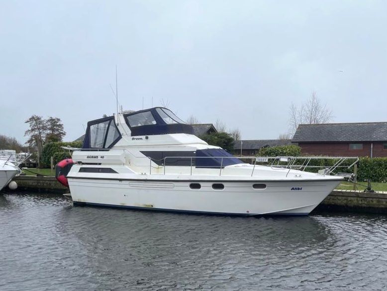 BROOM OCEAN 40 – 1987 – 2 x Ford Sabre 212hp diesel engines. 6 berth accommodation with two toilets and two showers. Specification includes electric windlass, folding radar arch, Eberspacher warm air heating, shore power supply with battery charger, 240v sockets and immersion, Raymarine A series plotter, VHF, 18″ Raydome, and autopilot. Fully equipped galley including; 4 burner hob, oven and grill. One of Broom’s rare flybridge models, a sought after combination of an aft cabin and raised steering position, providing excellent visibility when cruising. Just reduced!