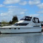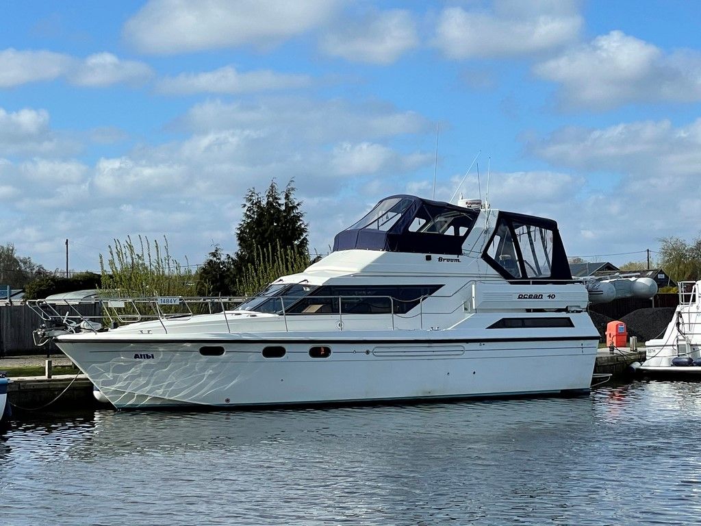 BROOM OCEAN 40 – Circa. 1987 – Powered by twin Ford Sabre 212hp diesels through shafts – 6 berth accommodation with two toilets and two showers. Specification to include; electric windlass, folding radar arch, Eberspacher warm air heating, shore power supply with battery charger, 240v sockets and immersion, Raymarine A series plotter, VHF, 18″ Raydome, autopilot. Fully equipped galley including; 4 burner hob, oven and grill! A rare flybridge model from Broom boats. The Ocean 40 is a cavernous cruiser ideal for those looking to spend extended time aboard!
