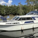 Broom Ocean 42 – 1983 – Powered by 2 x TAMD 60B 235hp diesel engines. 6 berth accommodation over 3 cabins and saloon with 2 showers and toilets. Specification including bow thruster, stern thruster, windlass, solar panels, trim tabs, ray marine C120, VHF , warm air heating, microwave, fridge , 4 burner hob, grill and oven. A spacious aft cabin Motorboat with island double master cabin. This Broom Ocean 42 offers fantastic accommodation and space.