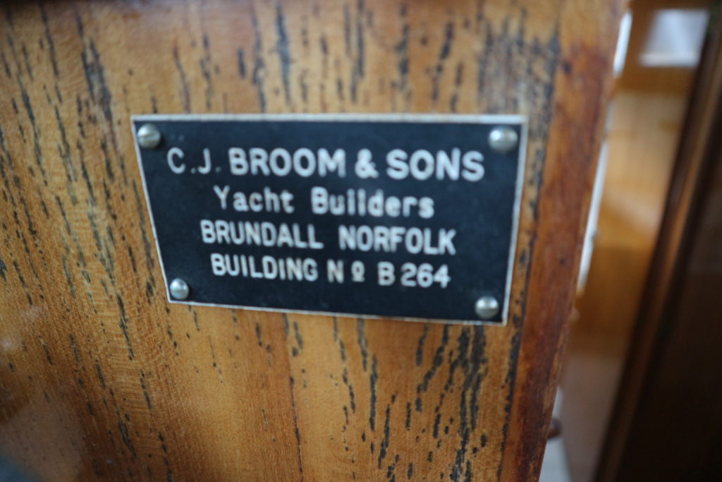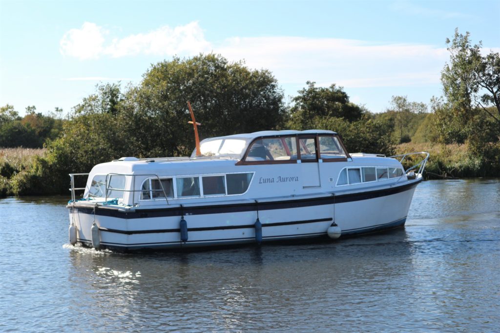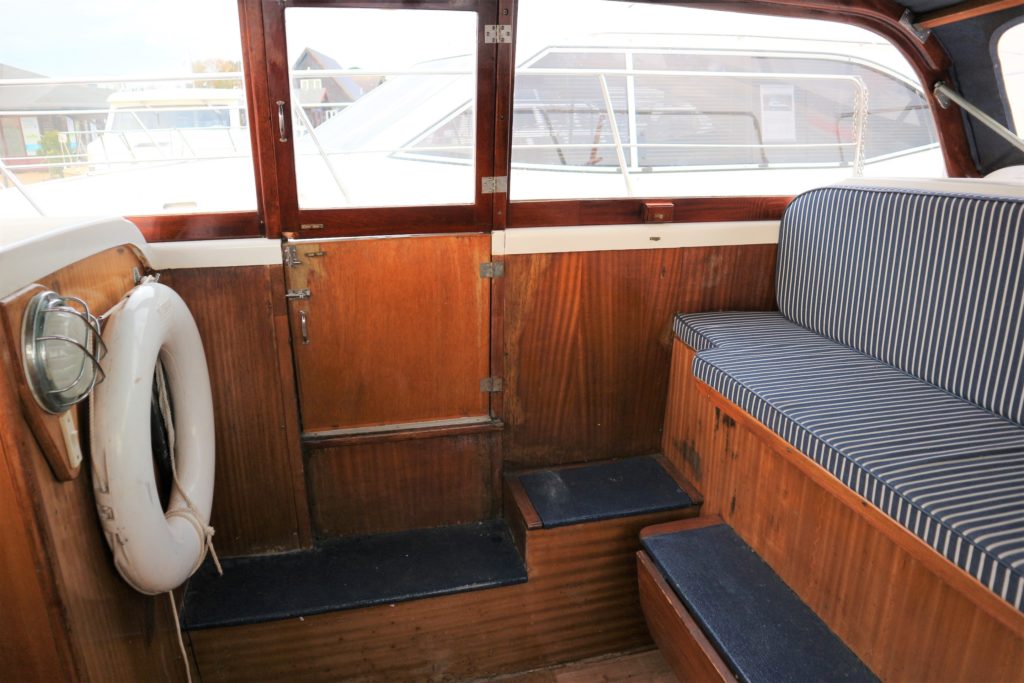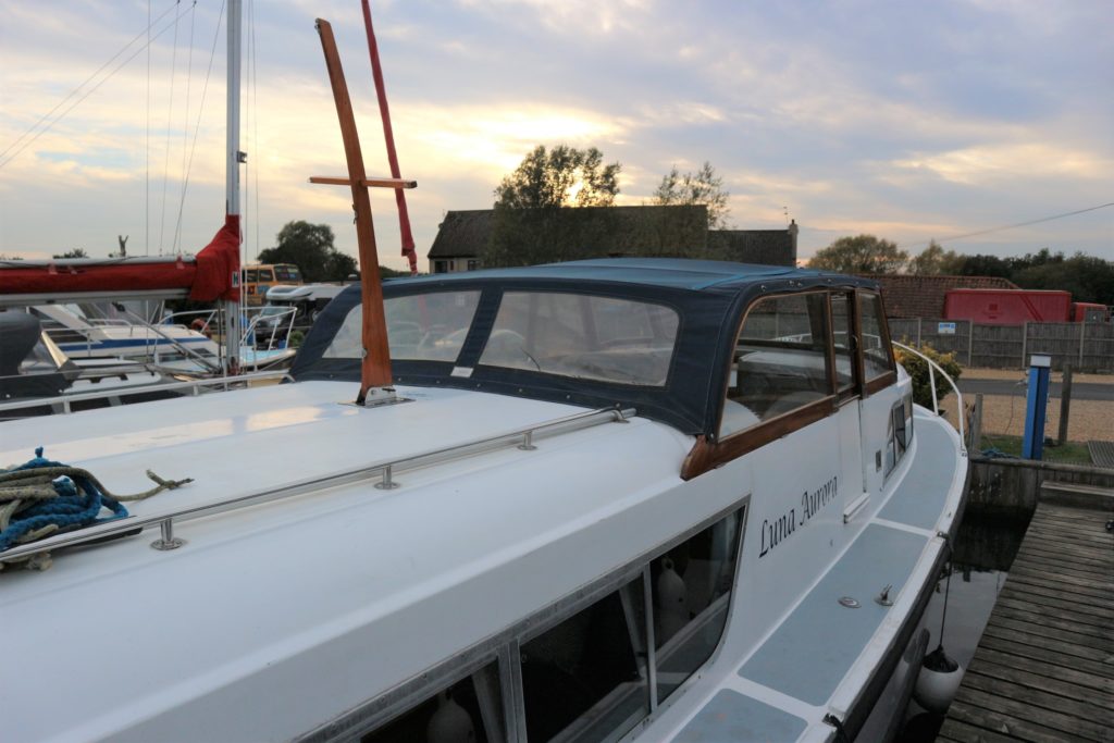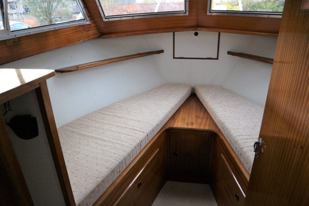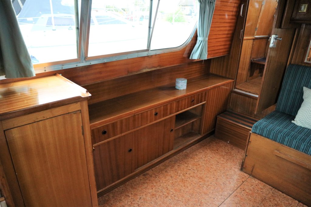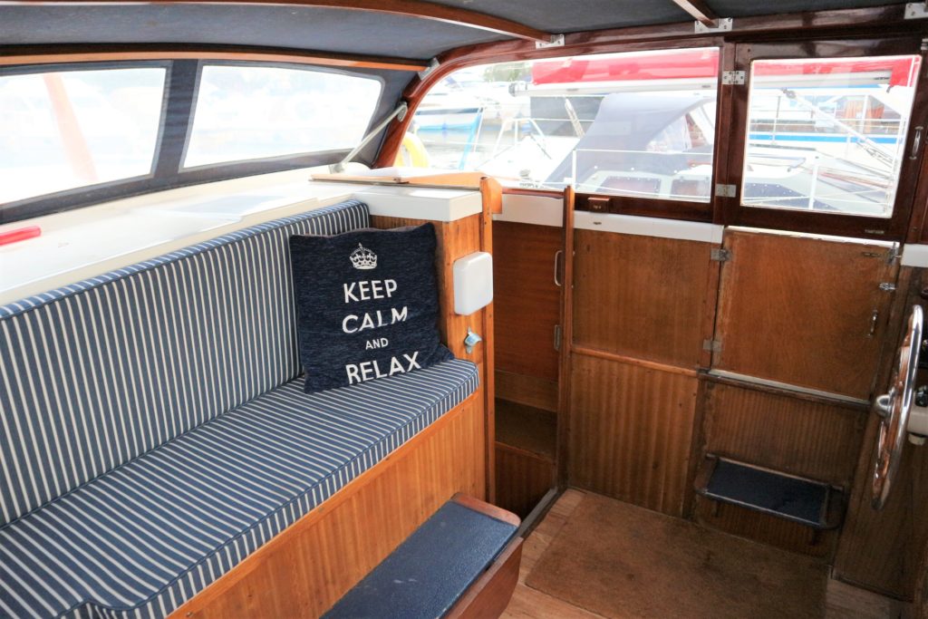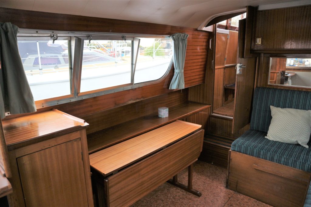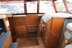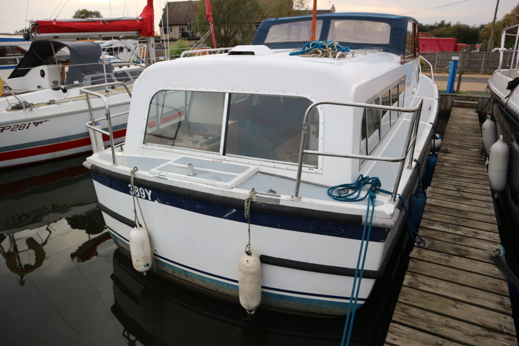 BROOM SKIPPER – Circa 1977 – 1 x Perkins 4.108 48hp Diesel Engine. 4 berth accommodation over forward cabin and spacious saloon with separate toilet and shower compartments. Galley with fridge, 4 burner hob, oven and grill. Benefiting from an engine overhaul in 2017. All over cover. Fitted with a bow thruster for ease of handling and folding wheelhouse screens offering a low air draft for exploring further afield.