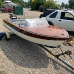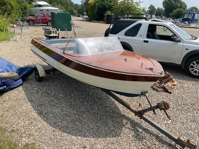 BROOM VIKING TIMBER DAY LAUNCH – Original Evinrude 18hp outboard (not been run for circa. 25 years) – Clever fold away pram hood mechanism – This very pretty classic run-about has been in the same family ownership for the past 36 years and dry stored for the past 25 years. She needs a thorough re-commissioning, new upholstery and hood, and realistically a modern power unit to make her a useable classic.