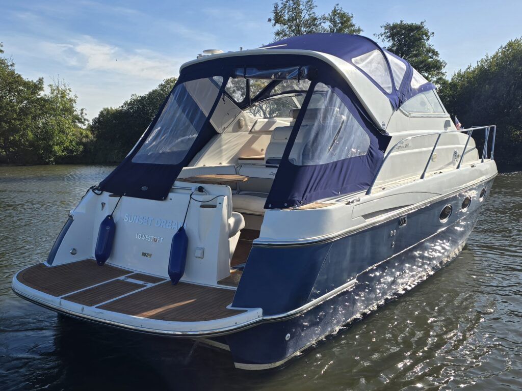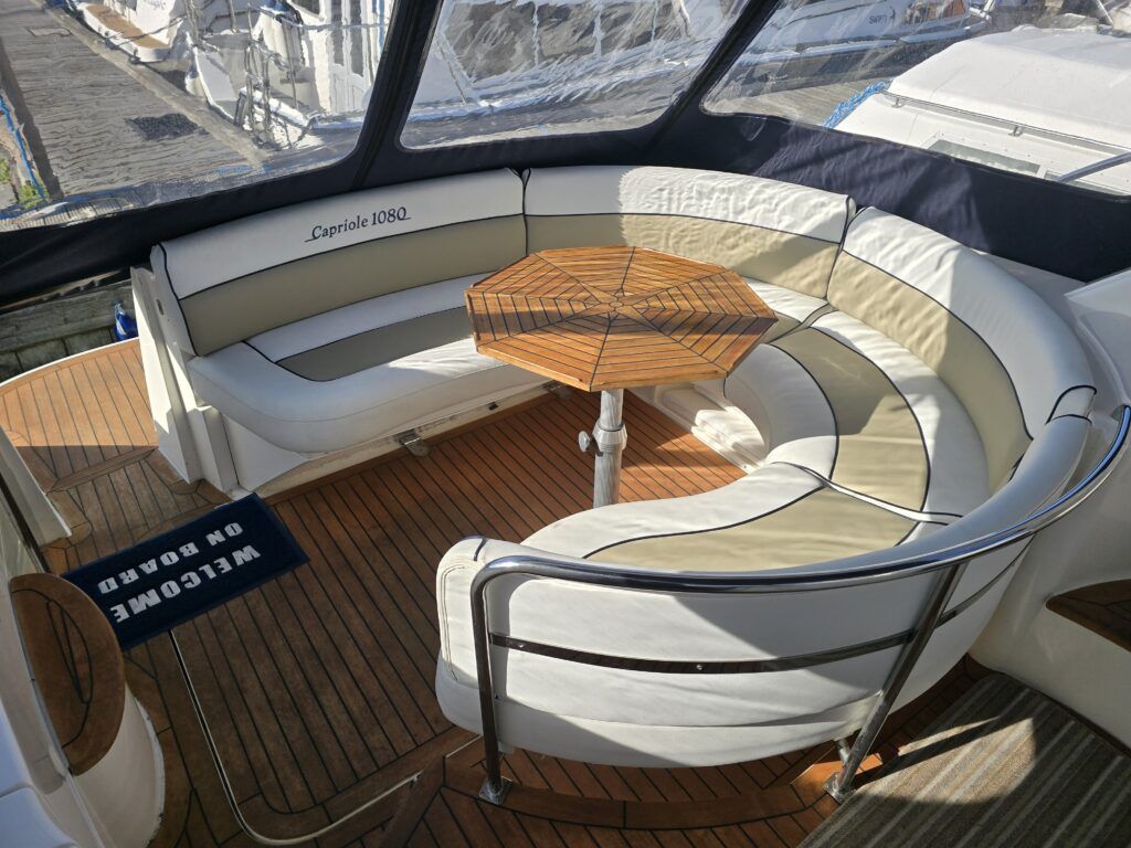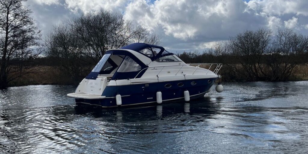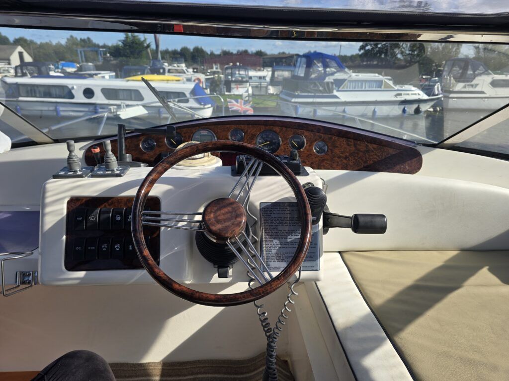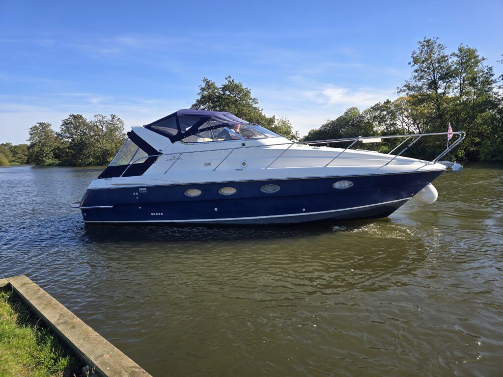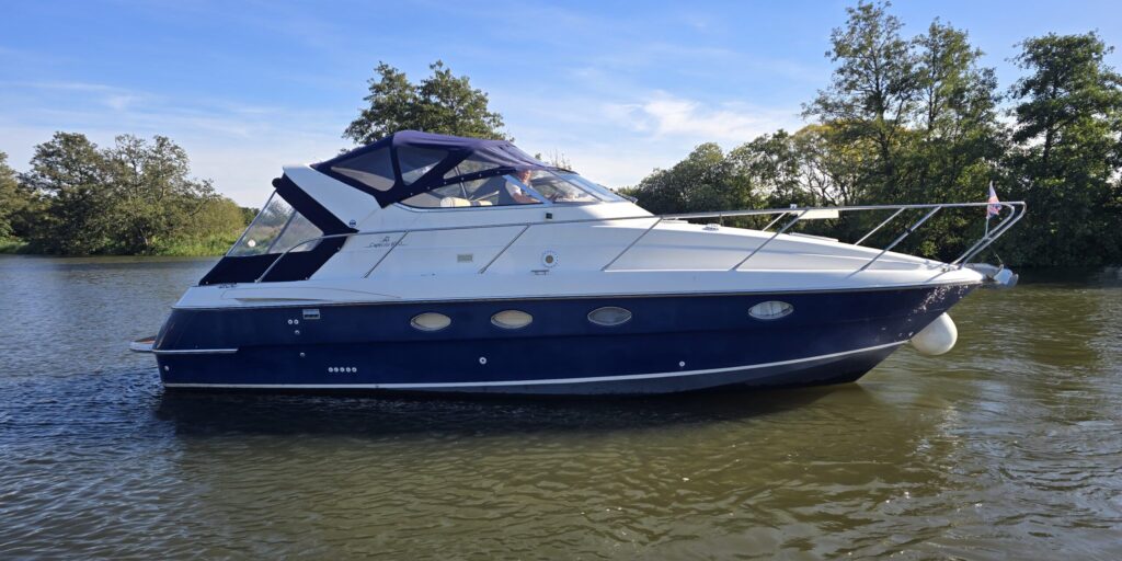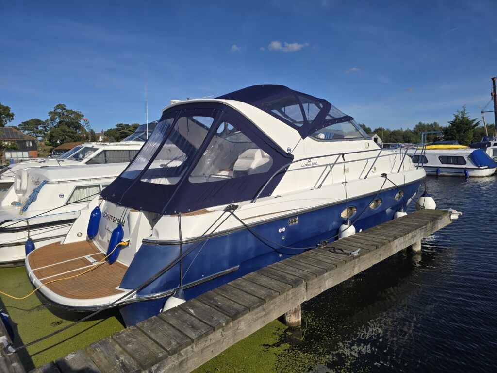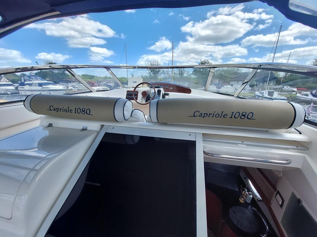 Capriole 1080 – 2002 – Powered by a Yanmar 4LHA-STP 240hp diesel engine on a shaft. 4 berth accommodation with a large island double master cabin, ensuite toilet and shower compartment and double guest cabin. Well specified including; bow & stern thrusters, electric windlass, warm air heating, folding radar arch, chart plotter, holding tank, teak cockpit and more. Serviced, polished and antifouled 2025. A sought-after single-diesel sports cruiser, well presented and boasting a high specification for river cruising whilst also offering coastal capabilities. Early viewing highly recommended