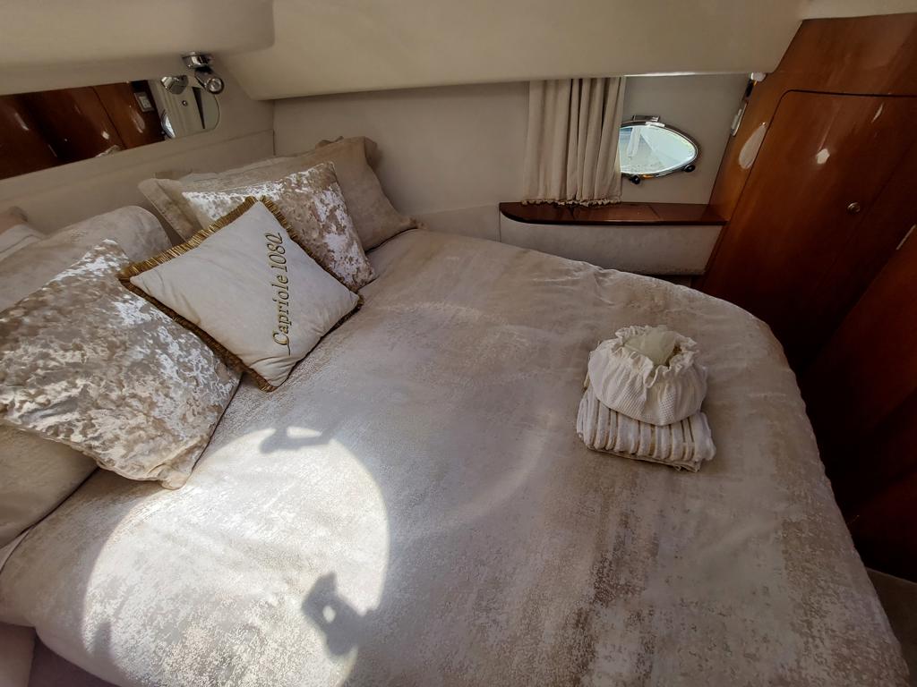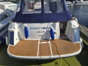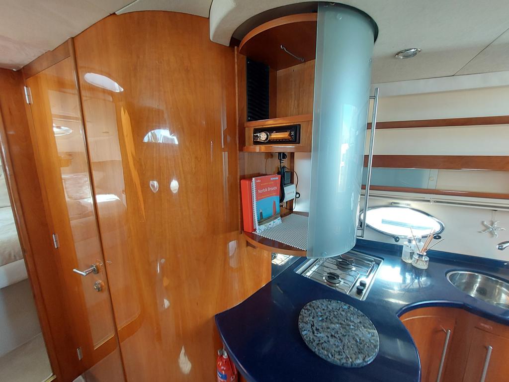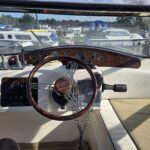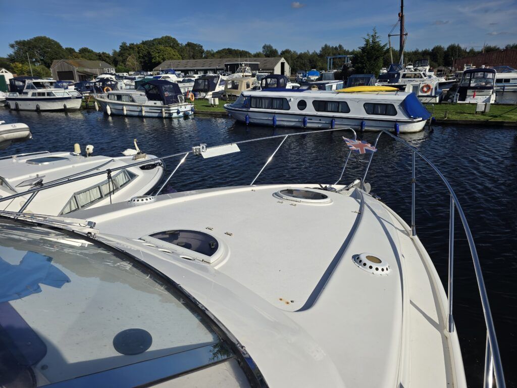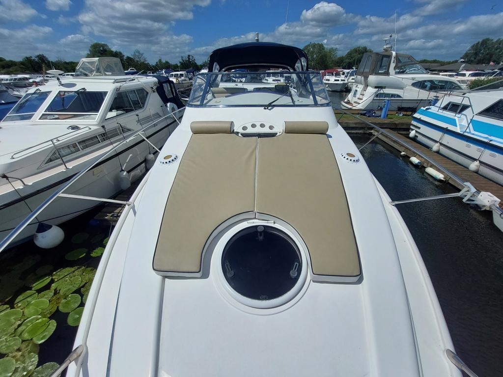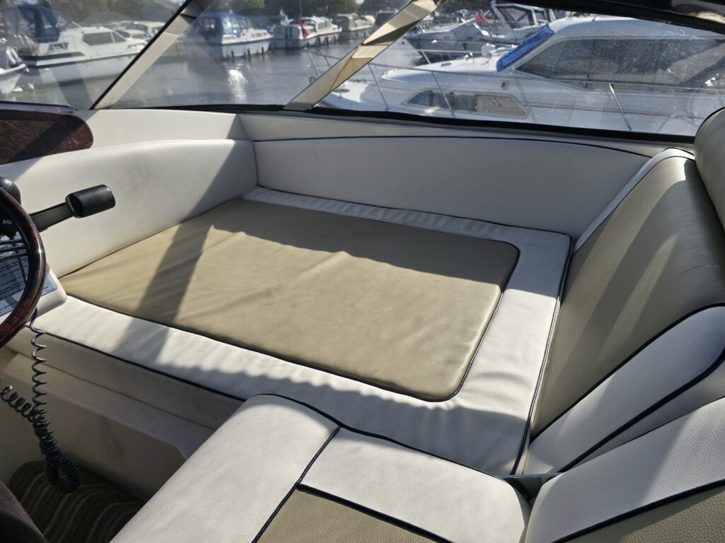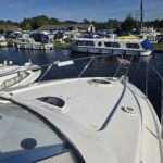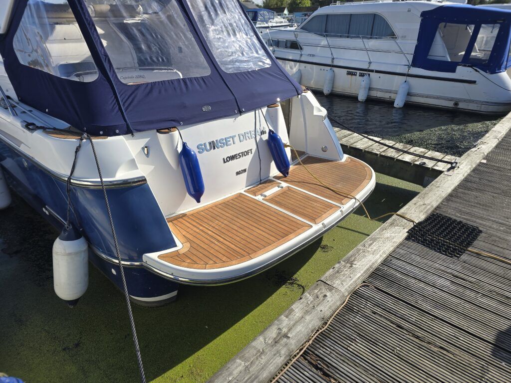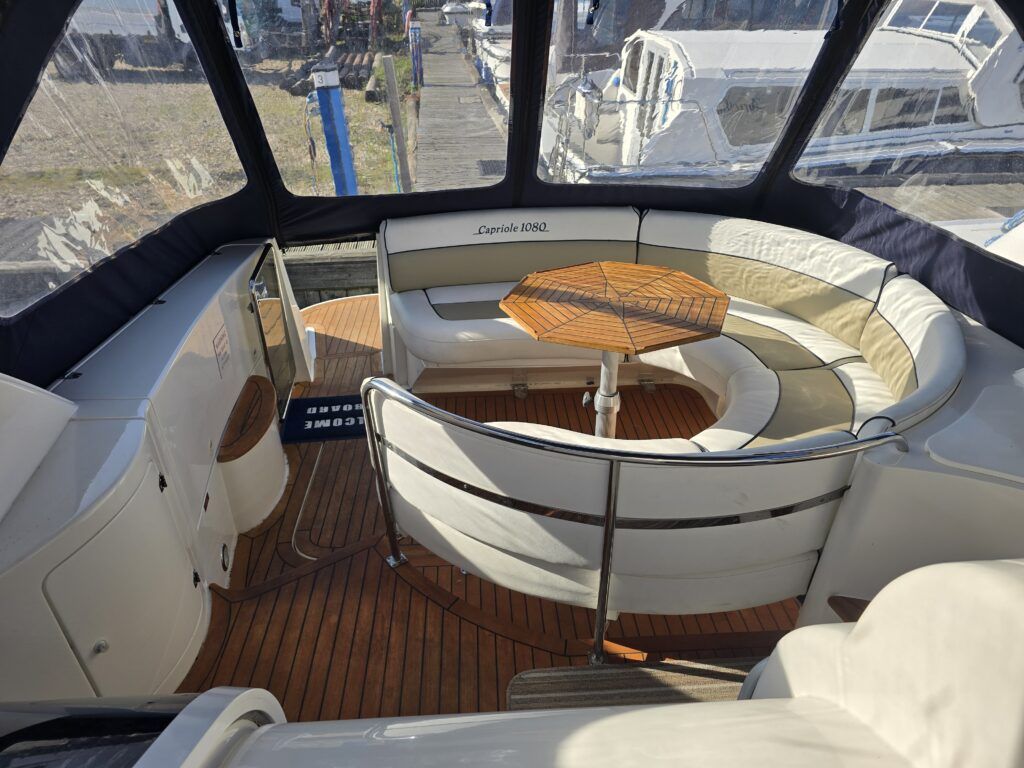 Capriole 1080 – 2002 – Powered by a Yanmar 4LHA-STP 240hp diesel engine on a shaft. 4 berth accommodation with a large island double master cabin, ensuite toilet and shower compartment and double guest cabin. Well specified including; bow & stern thrusters, electric windlass, warm air heating, folding radar arch, chart plotter, holding tank, teak cockpit and more. Serviced, polished and antifouled 2025. A sought-after single-diesel sports cruiser, well presented and boasting a high specification for river cruising whilst also offering coastal capabilities. Early viewing highly recommended