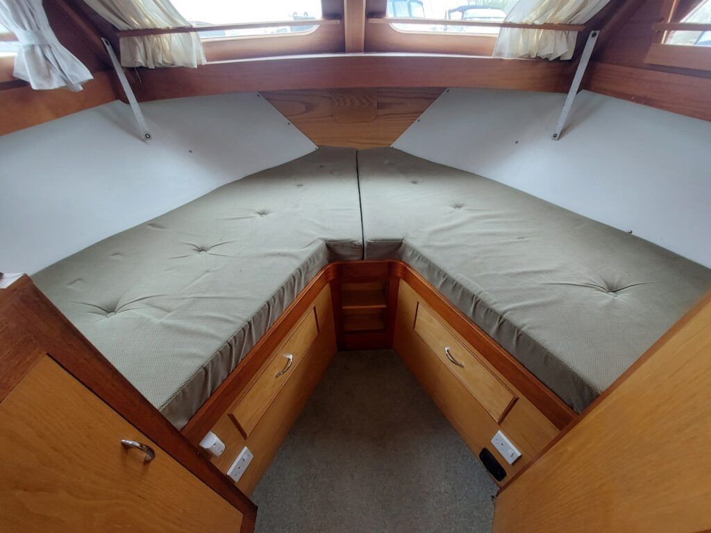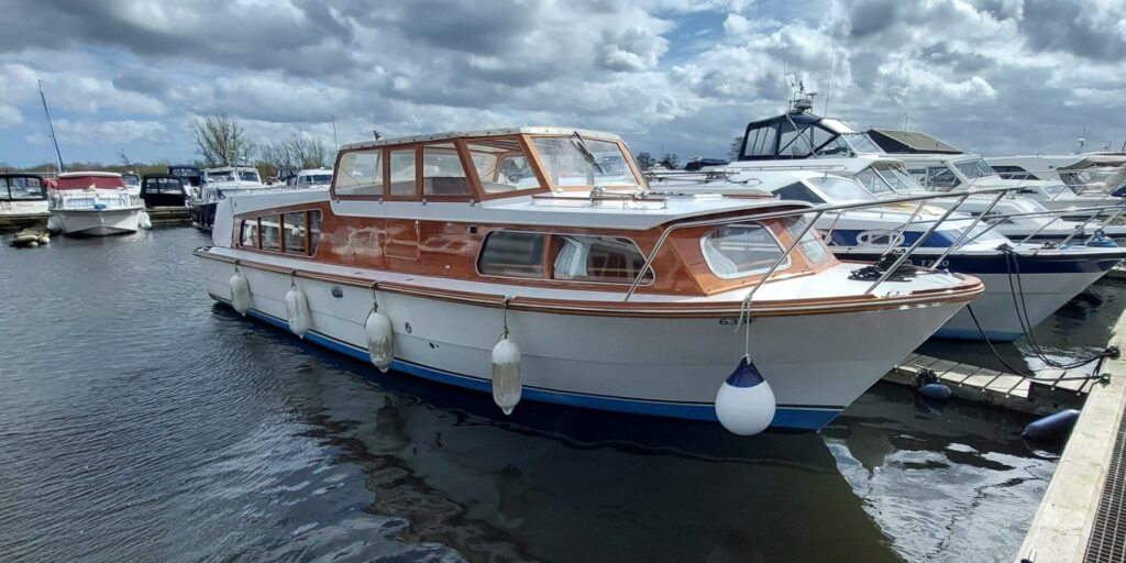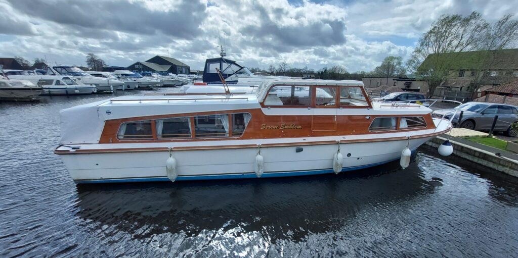 Ernest Collins 35 Modern Replica – 2002 – Single Nanni 4.150HE diesel engine through a shaft. 4 berth accommodation with two toilets and 1 shower compartment. Specification to include; bow-thruster, warm air heating, inverter, immersion heater, speed log, folding wheelhouse windows. “Serene Emblem” is a stylish boat built on a Sheerline 10/70 hull and combines the looks of a classic Broads cruiser with the practicality of a modern craft. More details and pictures to follow. BSC 06/07/25