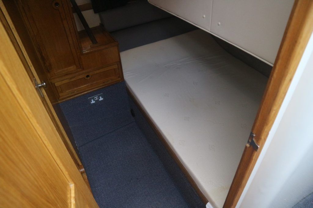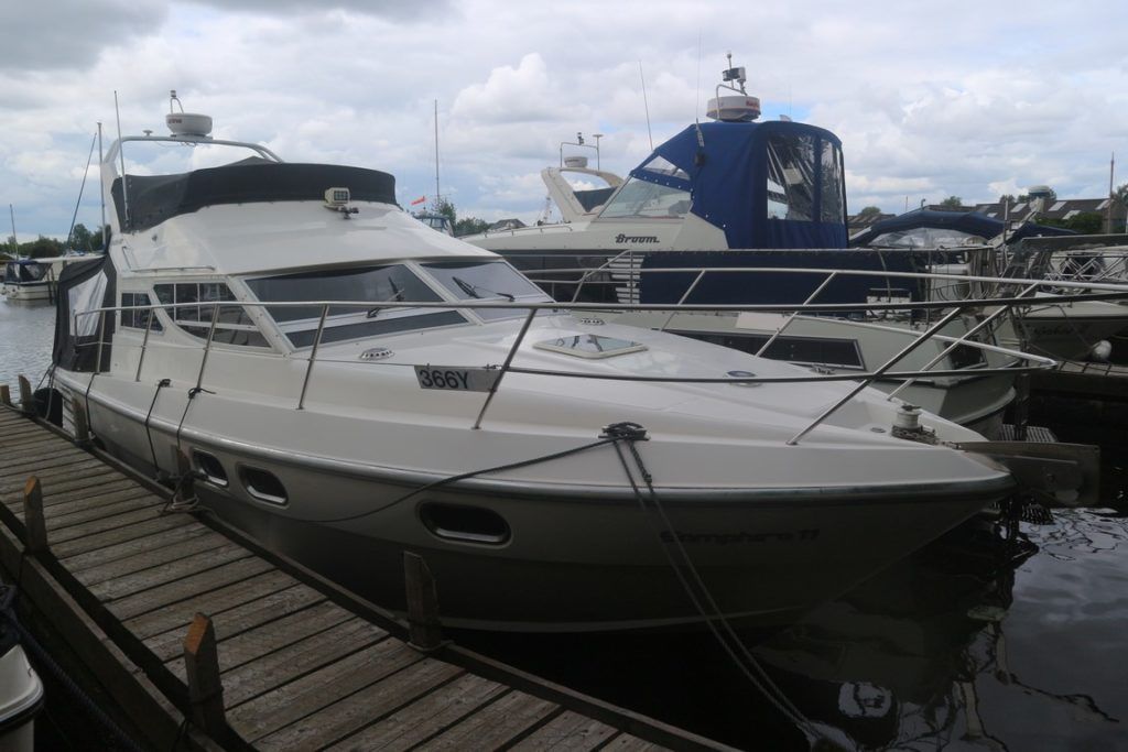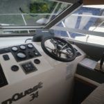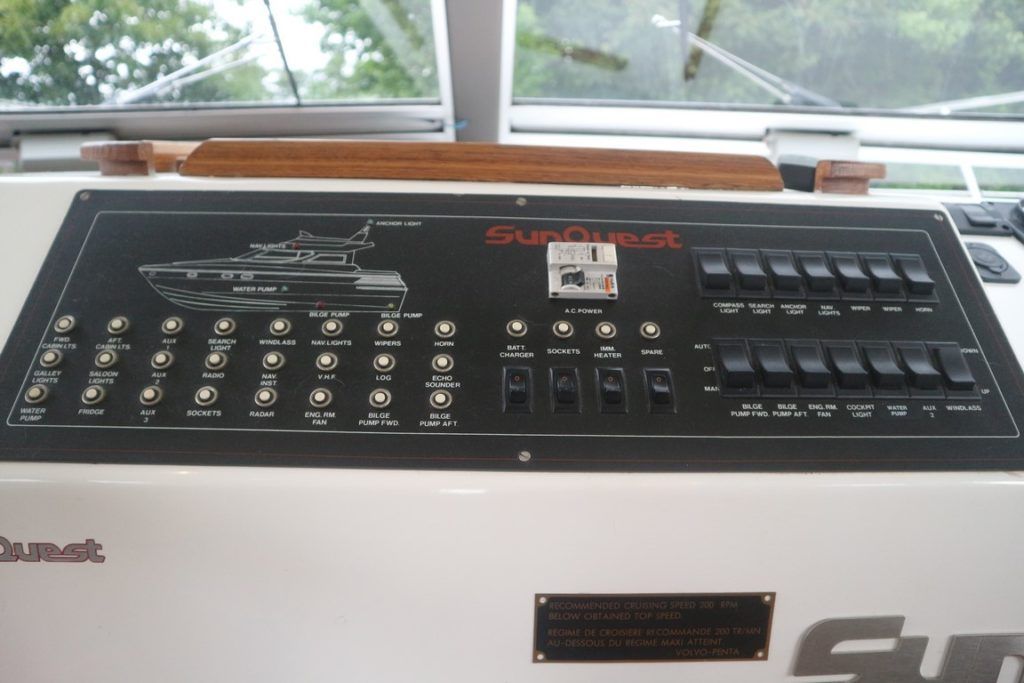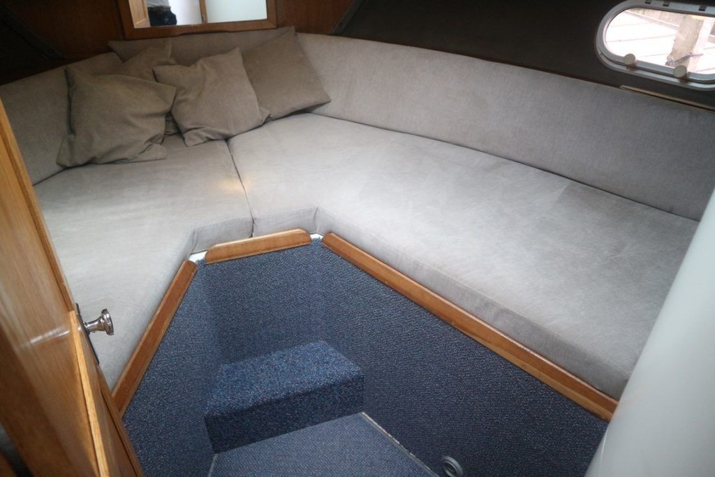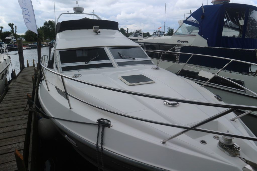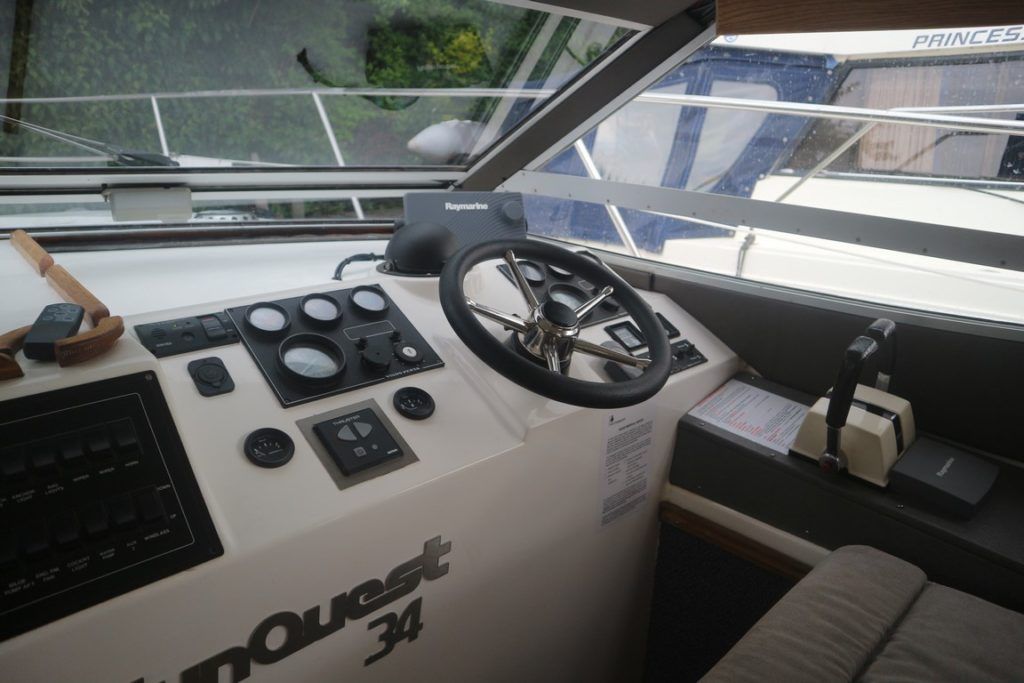 COLVIC SUNQUEST 34 – 1990 – Powered by twin Volvo AQAD31A 130hp diesels. 5 berth accommodation with 2 x toilets (1 x electric) and a shower. Well specified to include; Bowthruster, Combi battery charger and inverter, warm air heating, electric windlass, range of navigation equipment including a Raymarine Hybrid touch plotter and shore power supply. Folding radar arch. BSC 06/2019. Well equipped and great accommodation for a 34ft cruiser!