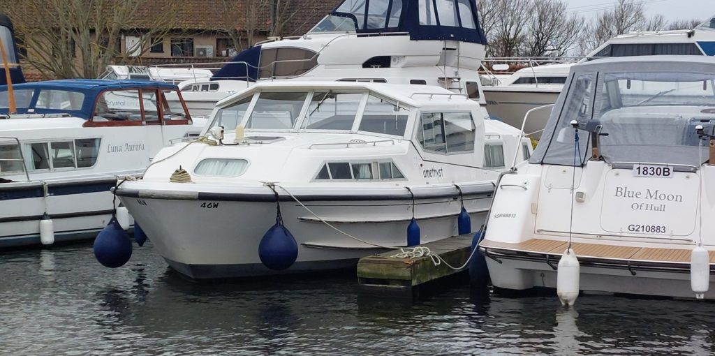 Connoisseur 40 – 1993 – Single Nanni 43hp diesel engine through an hydraulic drive. 4 berth accommodation with two toilet/shower compartments. Specification to include; bow-thruster, battery charger, inverter, 2 holding tanks, 2 electric flush toilets, warm air heating, microwave oven. “Amethyst” has been in the same hands since 2011 and has clearly been well looked after. She is a nice example of these spacious motor-cruisers, perfect for exploring the Norfolk Broads. More external pictures to follow. BSC 02/06/2027