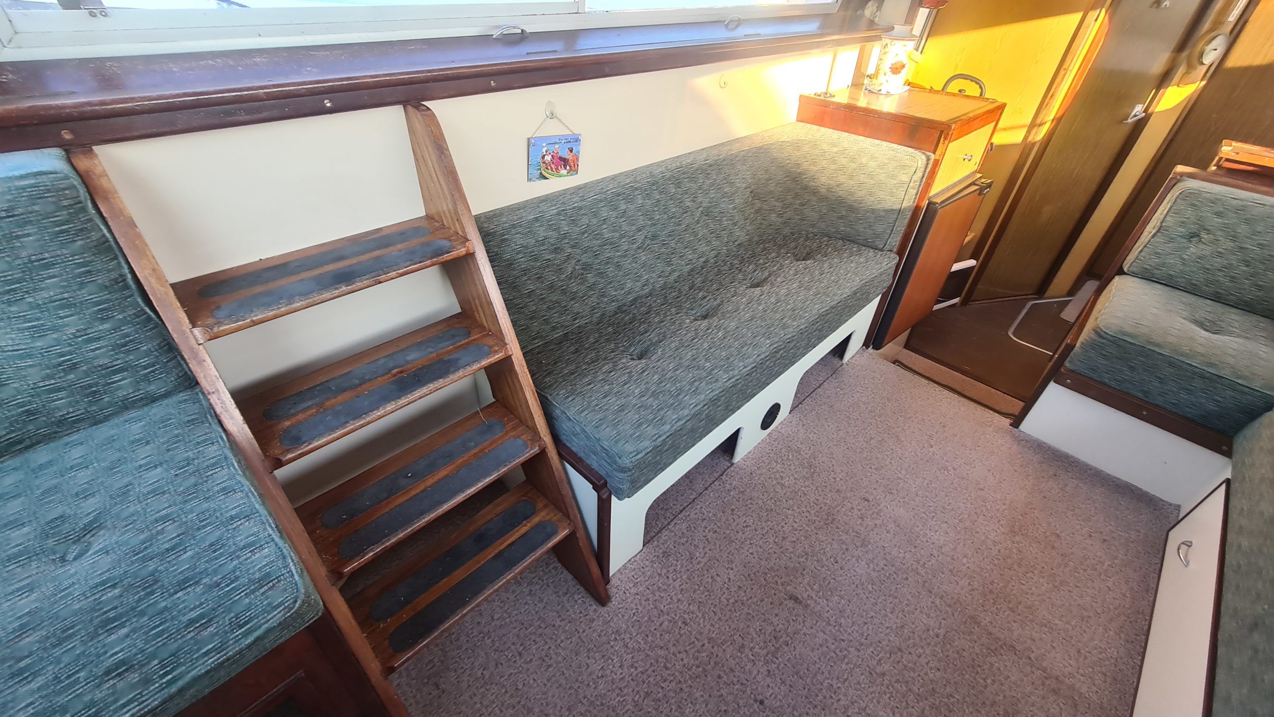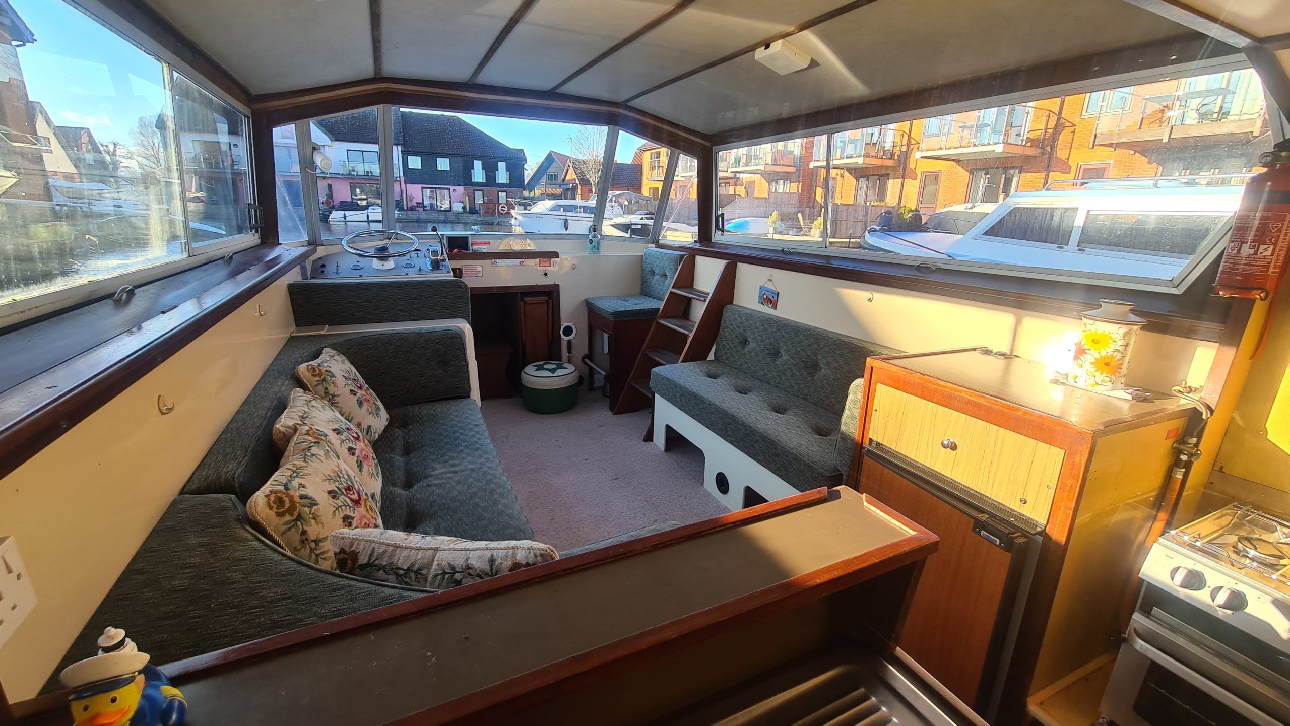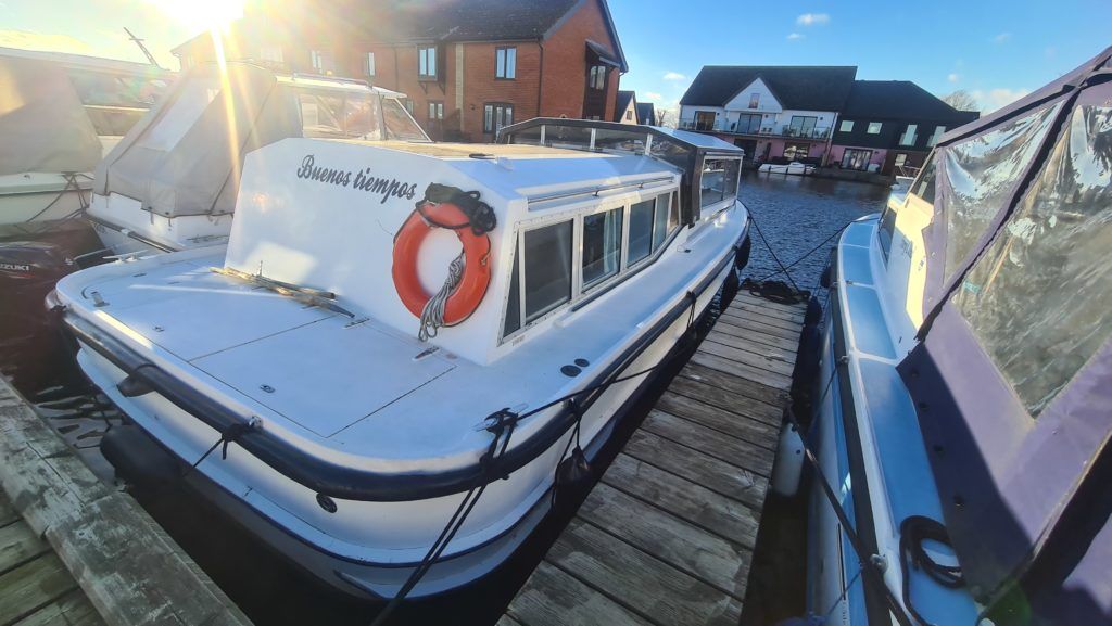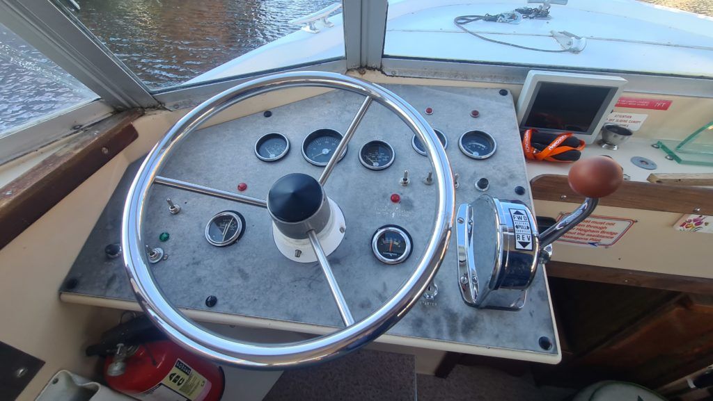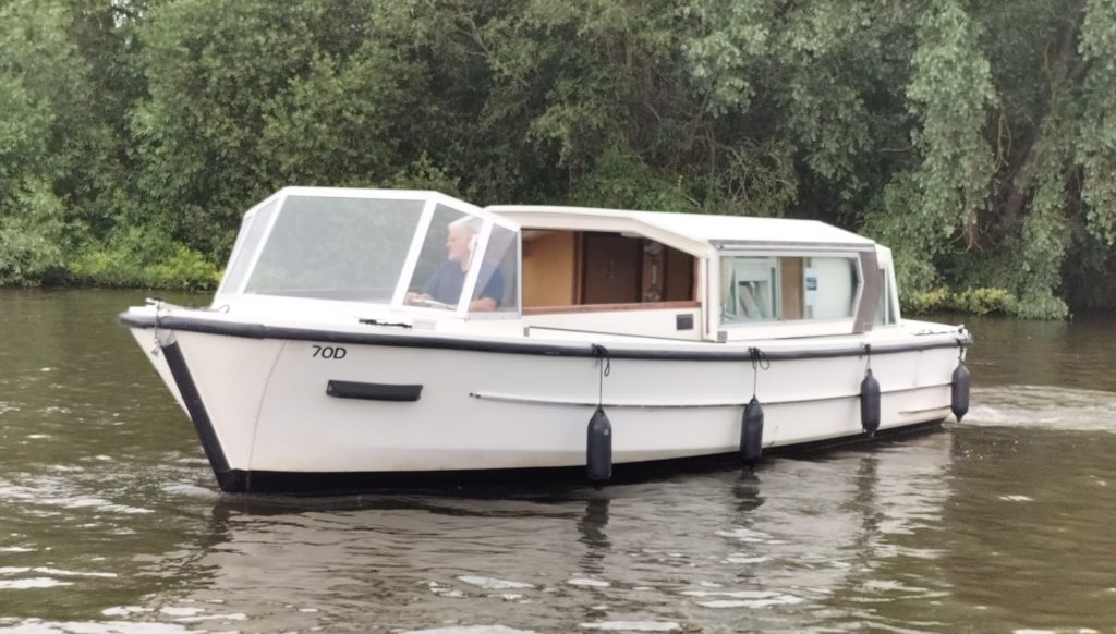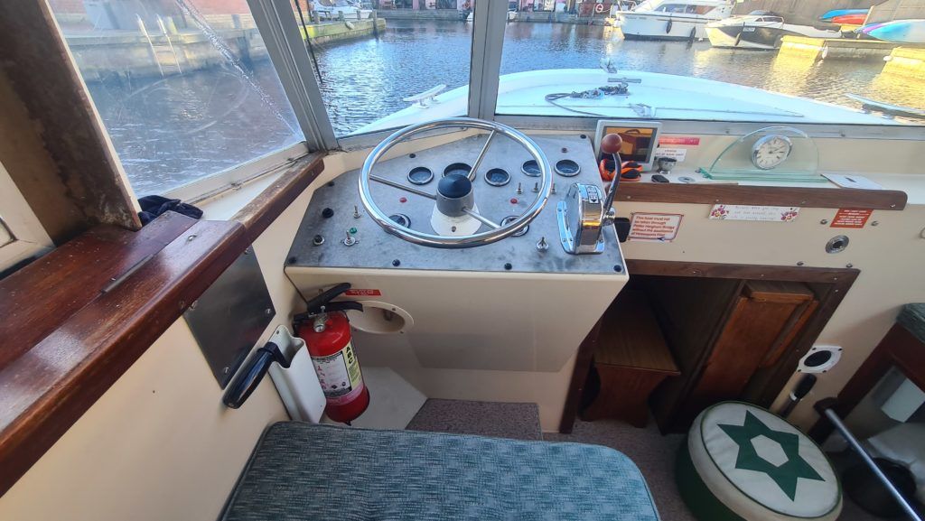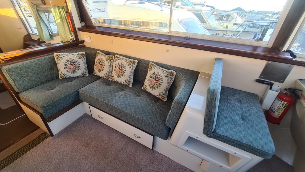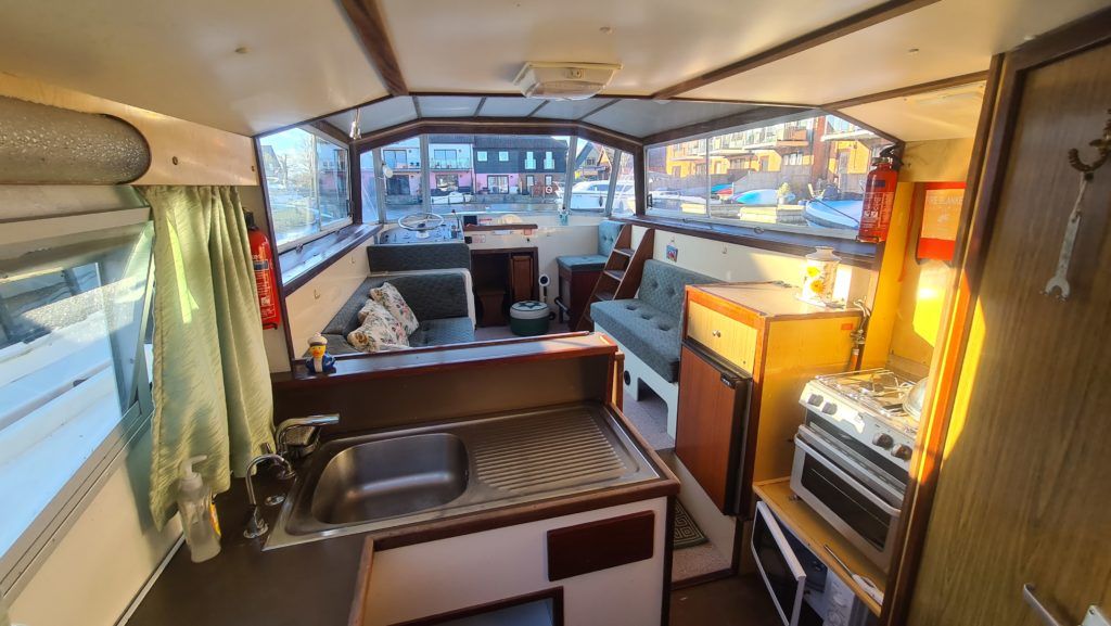 Connoisseur 900 River Cruiser – circa 1984, BMC 36hp diesel on hydraulic drive. 4 berth accommodation, cooker and microwave new 2022, 12v fridge, new electric toilet and separate shower, sliding roof, BSS 2025, diesel heating system (new 2022). Engine service and hull antifouled 2022, anchor winch 2022, new hot water heater 2022, battery charger new 2022, reversing camera. A spacious family cruiser with good accommodation, perfect for extended cruising ideal for cruising the broads waterways.