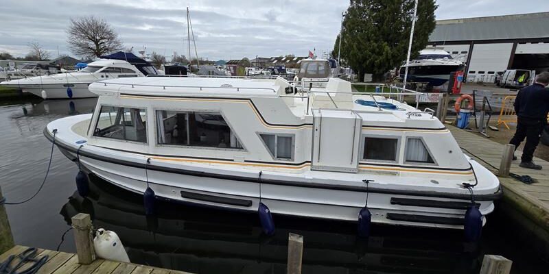 Connoisseur 900 FB – Circa 1988 – Powered by a Nanni N4.38 37.5hp diesel engine through a hydraulic shaft drive. 4 berth accommodation with separate toilet and shower compartments. Specification to include; shore power, inverter, warm air heating, hydraulic steering, full galley facility, holding tank, electric toilet, teak and holly style flooring and more. An intelligent 4-berth inland cruiser featuring dual steering positions and a low air draft for a flybridge. NYA Stock – Sold as traded in