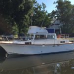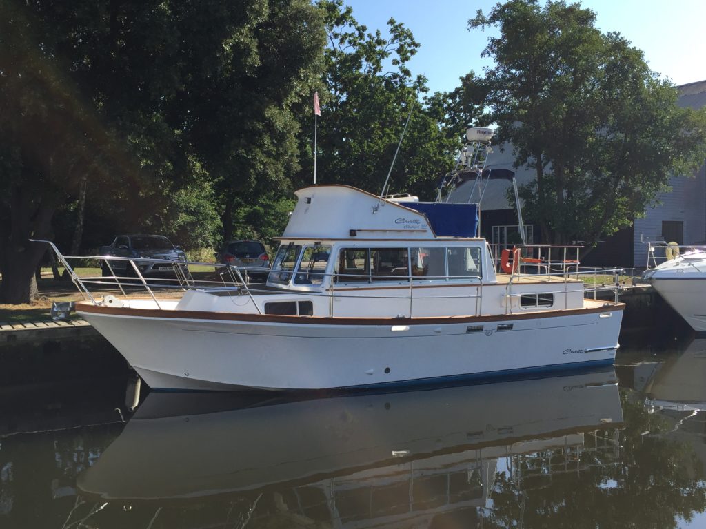 CORVETTE 32 CLASSIQUE 300 – Circa 1990 – Powered by twin Thornycroft 150hp diesels through shafts. 6 berth accommodation with 2 toilets and 1 shower. Specification to include; Warm air heating, trim tabs, shore power with battery charger, immersion and 240v sockets, a range of navigation equipment including Raymarine E80 plotter and VHF. Synthetic teak laid decks and foredeck and folding radar arch for increased inland access. Eye catching Trawler design with plenty packed in for 32 foot!