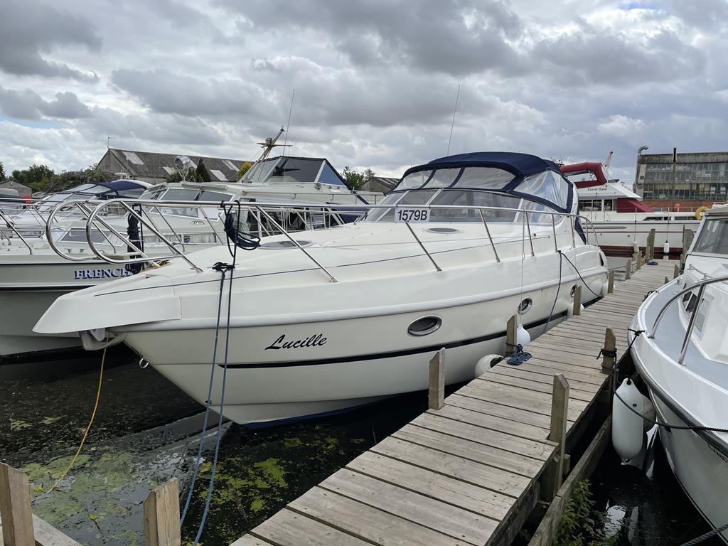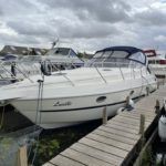 Cranchi Zaffiro 34 – 2002 – Powered by 2 x Volvo KAD 43 DP 230hp diesel engines through sterndrives. Up to 6 berth with a large offset double in the forward cabin, and ample storage. There are a further two single berths in the rear cabin with mini sofa. 1 x toilet/shower compartment. Blaupunkt Toronto 420BT radio/CD with remote control at the helm. Galley with 2 burner gas hob and electric hot plate, fridge and sink. Specification including QL Bow thruster, shore power, Lofrass electric windlass with controls at the helm, immersion heater, electric toilet, synthetic teak decking to bathing platform & cockpit, ICOM VHF M330, BSC 07/26. A well presented sports cruiser offering spacious accommodation and a social cockpit space for entertaining.