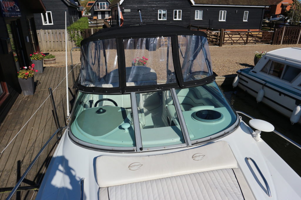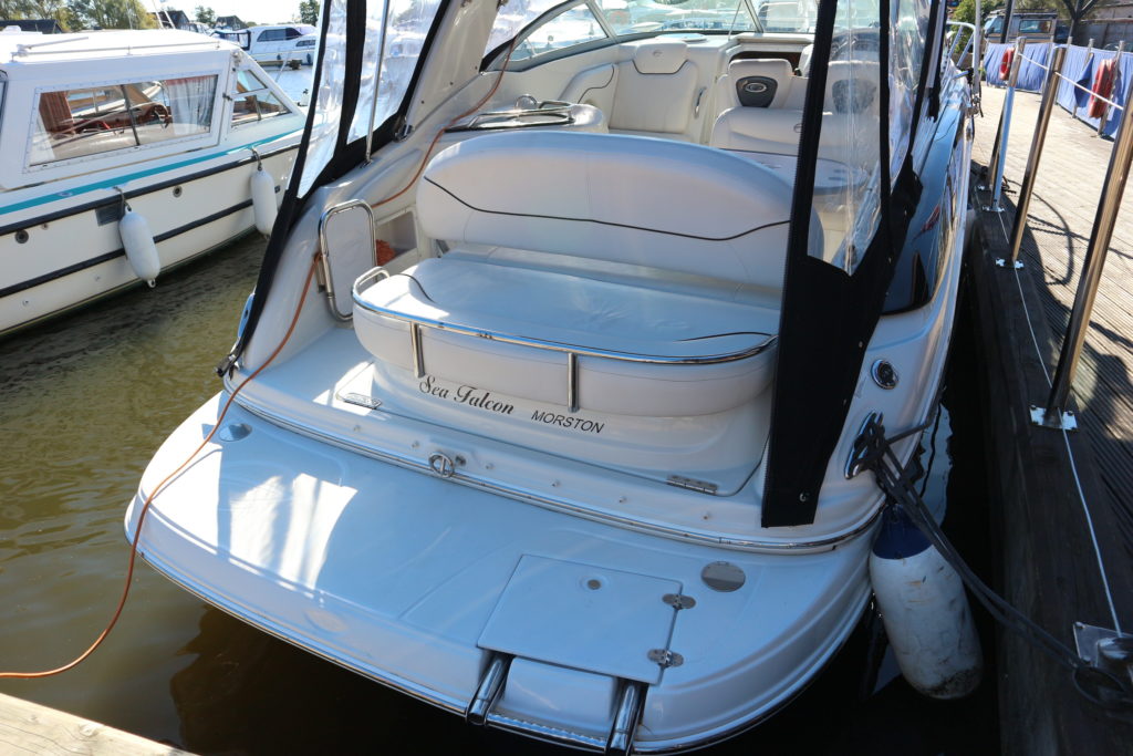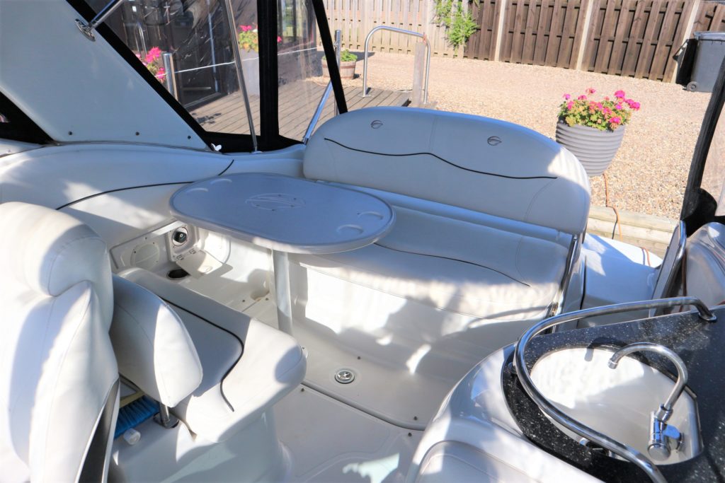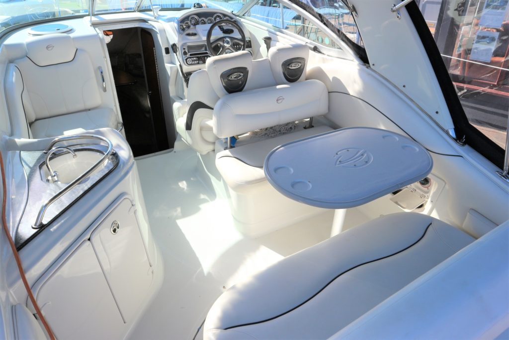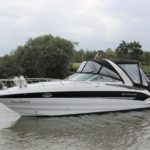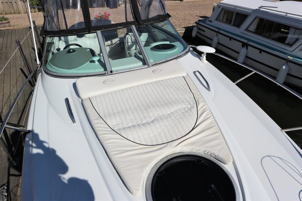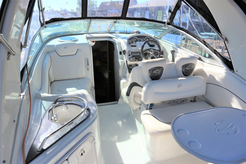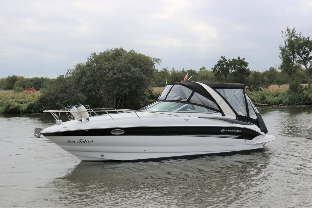 CROWNLINE 270 CR – 2007 – 1 x VW V6 225hp Diesel Engine. 4 berth accommodation with 1 x toilet to holding tank/shower compartment. A high spec including bow thruster, shore power, battery charger, immersion heater, warm air heating to cabin & cockpit, electric windlass, folding GRP arch, VHF, GPS, canopy new 05/18. A sleek sports cruiser combining great performance with style and diesel engine practicality.