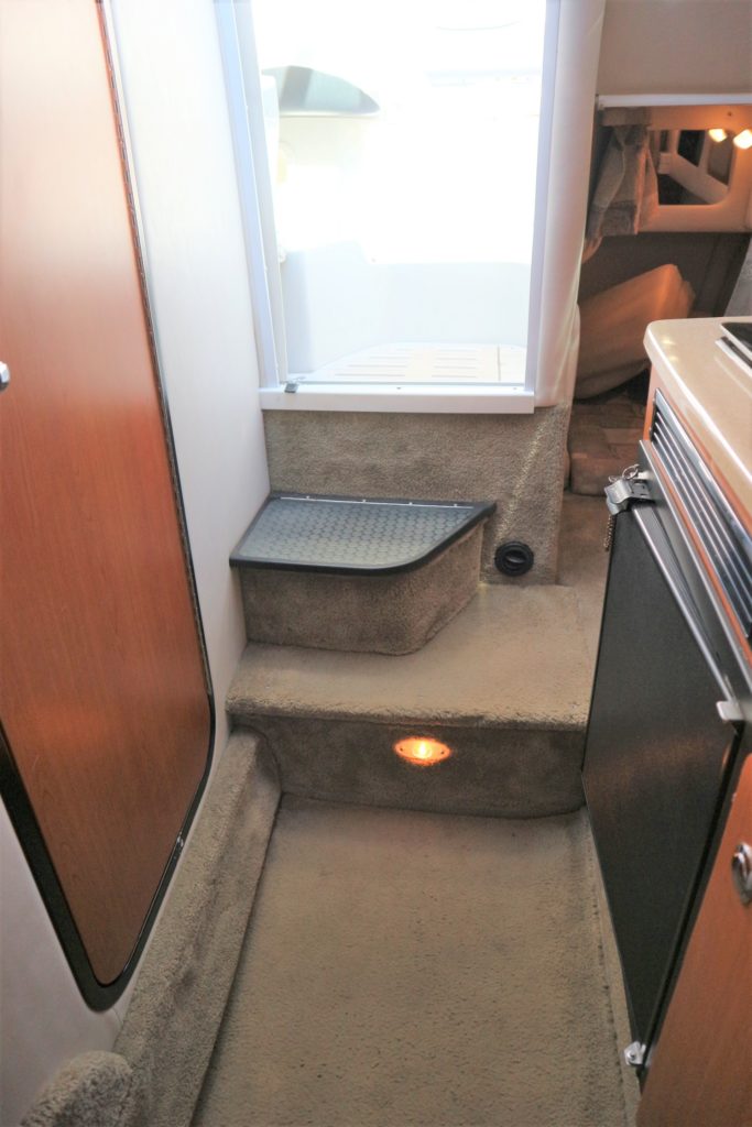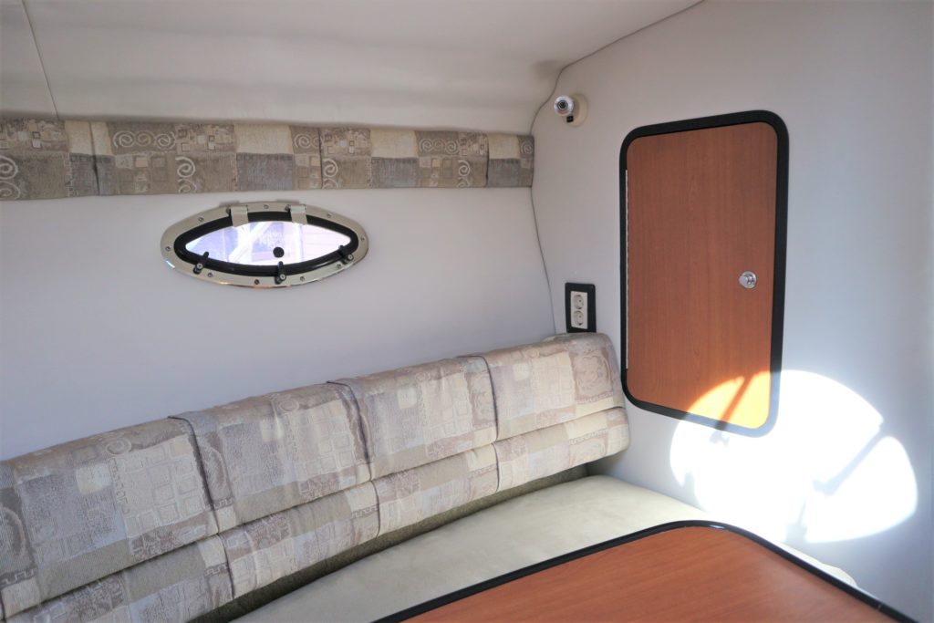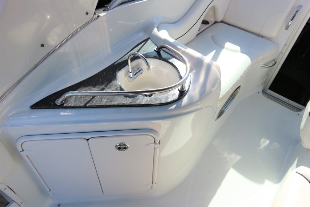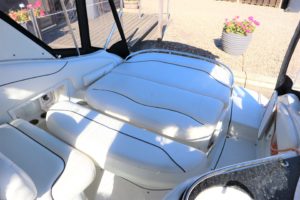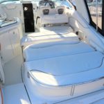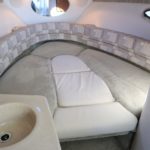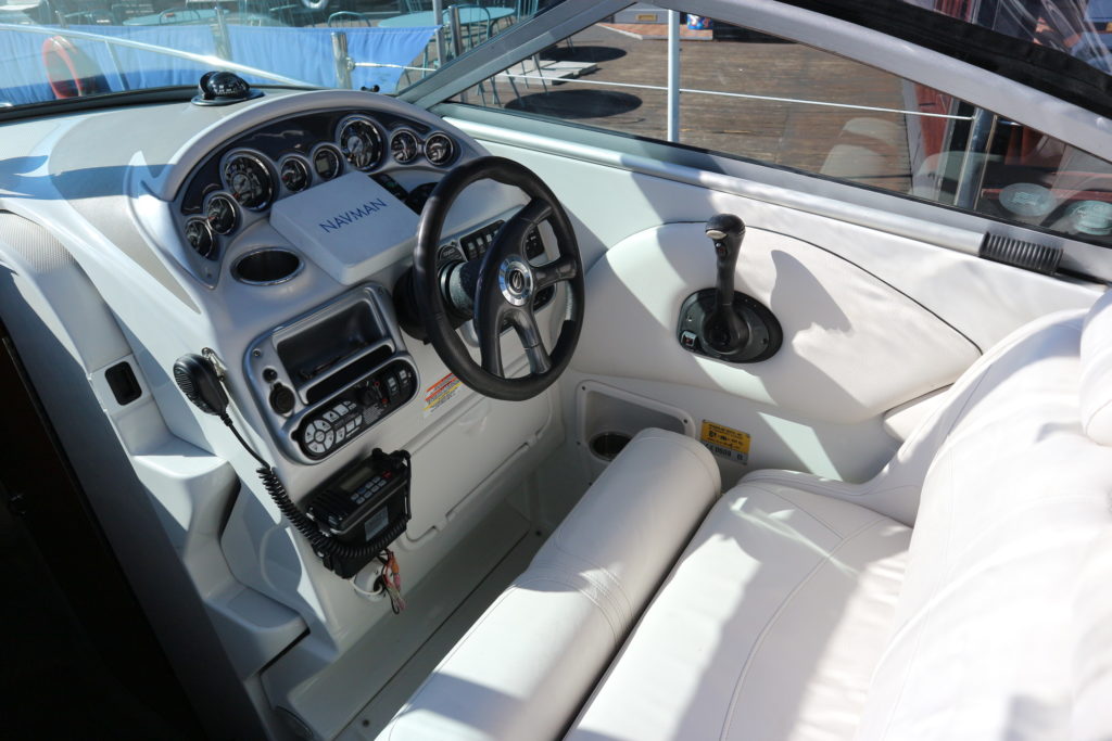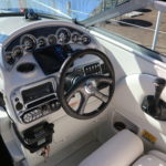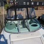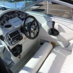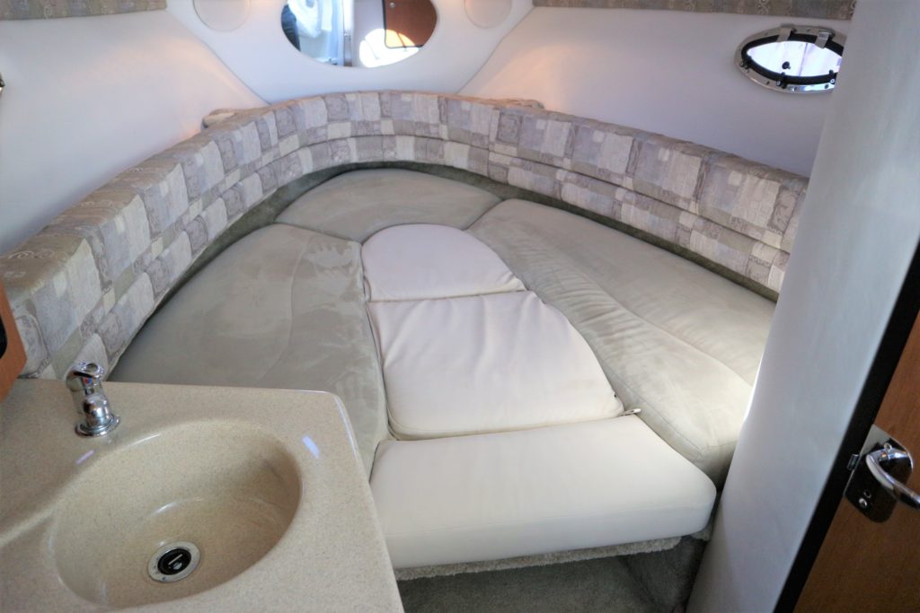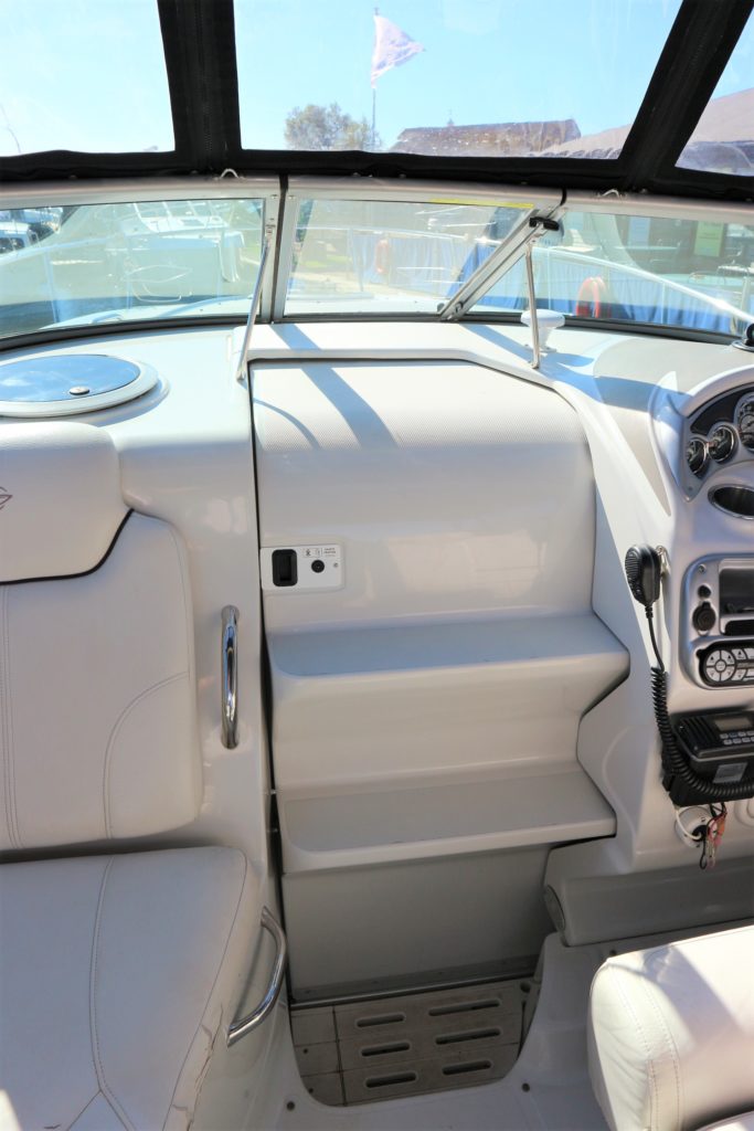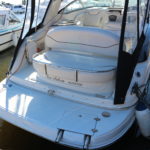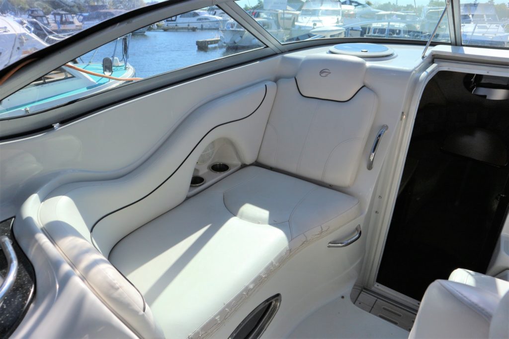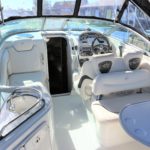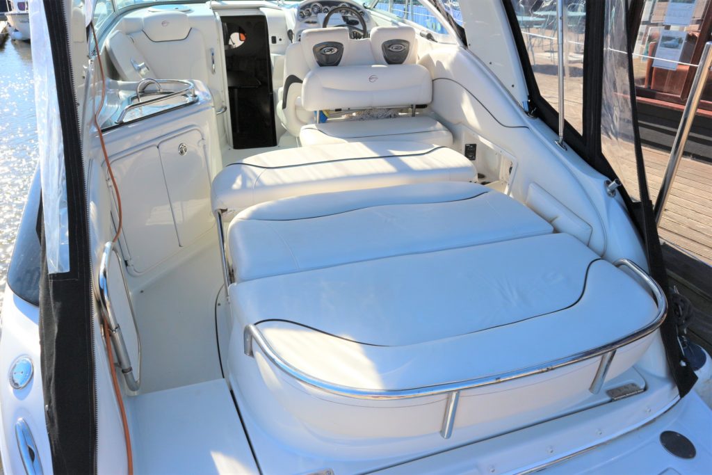 CROWNLINE 270 CR – 2007 – 1 x VW V6 225hp Diesel Engine. 4 berth accommodation with 1 x toilet to holding tank/shower compartment. A high spec including bow thruster, shore power, battery charger, immersion heater, warm air heating to cabin & cockpit, electric windlass, folding GRP arch, VHF, GPS, canopy new 05/18. A sleek sports cruiser combining great performance with style and diesel engine practicality.