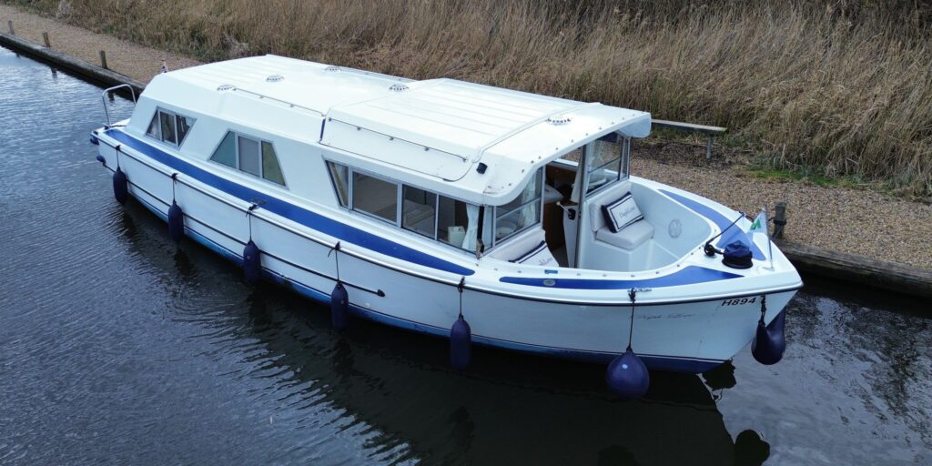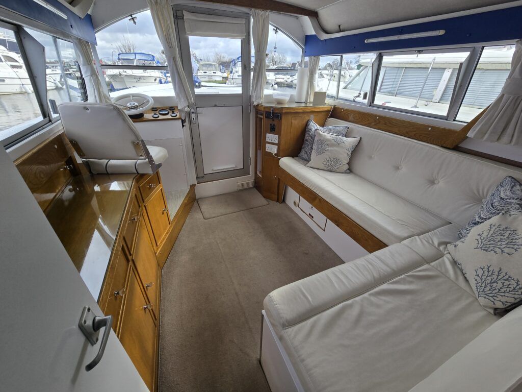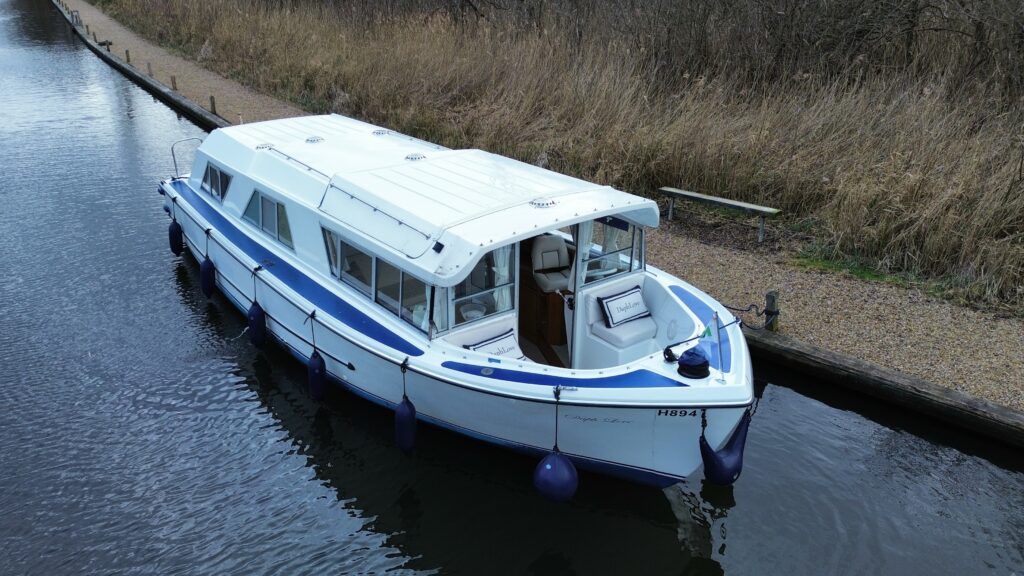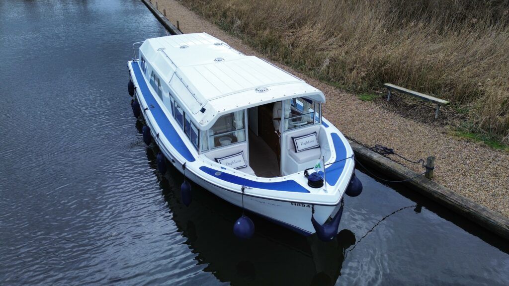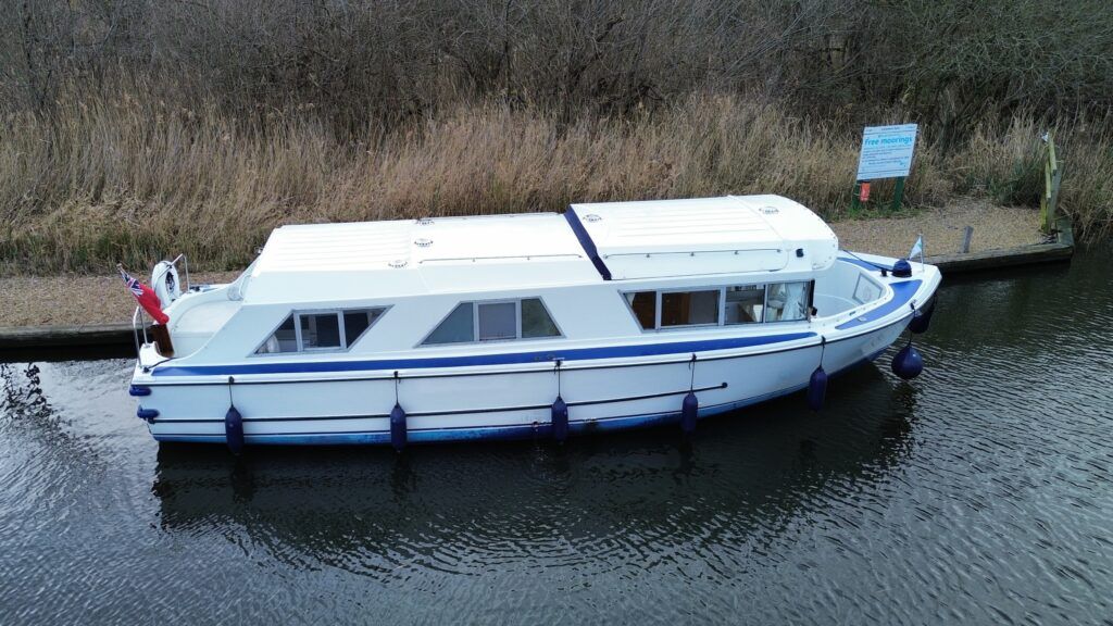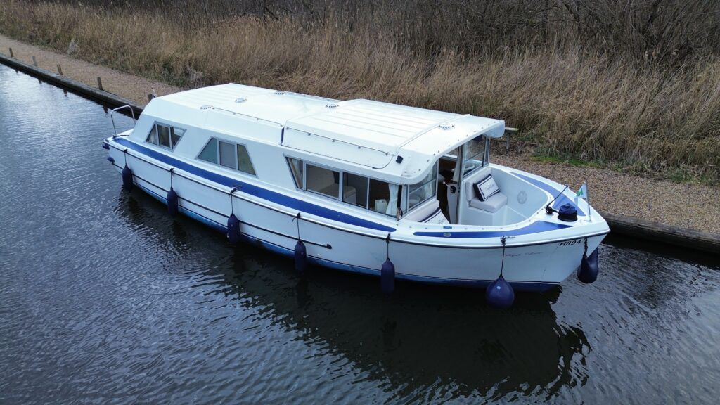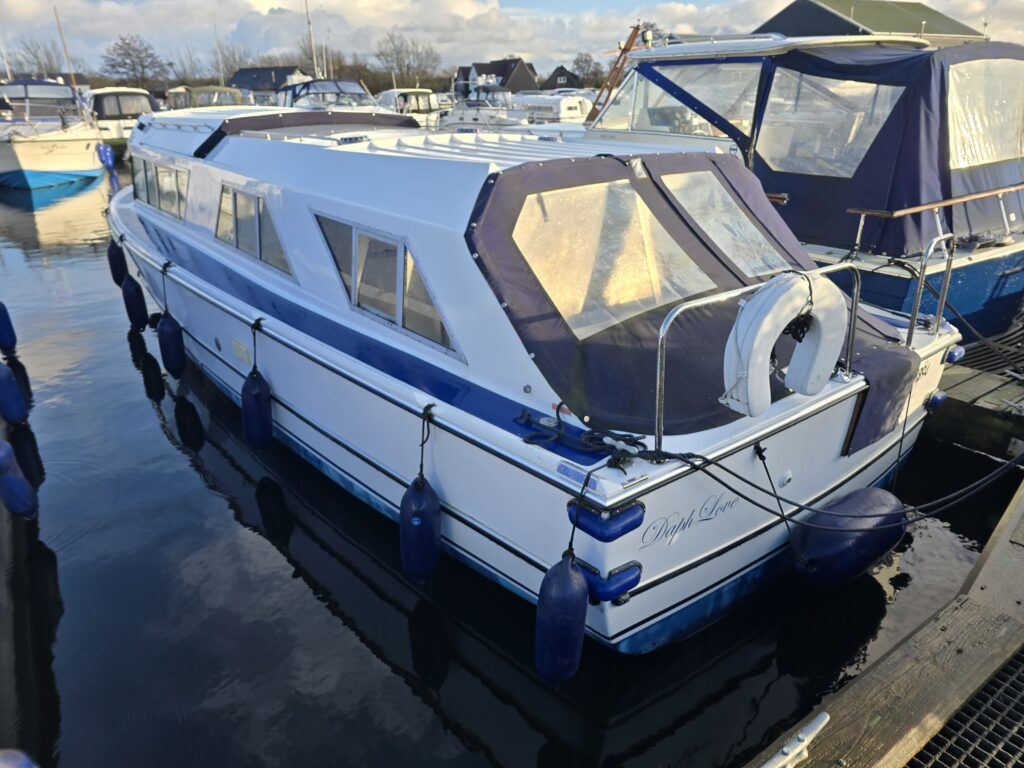 Dawncraft DC30 – 1975 – Powered by a BMC Thornycroft 1.5 diesel engine. 5 berth accommodation with a separate toilet & shower compartment. Specification to include; Bow and stern thrusters with remote, warm air heating, shore power, inverter, battery charger, immersion, holding tank, forward and aft canopies, New diesel tank 2025, Galley refurbished 2022. Engine serviced and antifouled 2025. BSC 03/30. A well-maintained, highly specified DC30 offering excellent family accommodation and capable of passing beneath most Broadland bridges.