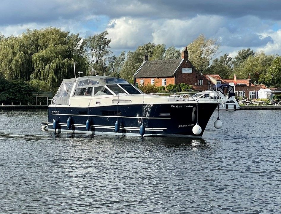DELPHIA 1050 ESCAPE – 2016 – Powered by a single Nanni N4.50 (50hp) diesel through a shaft – 4 berth accommodation with toilet and shower – Specification to include; Bow and sternthruster, 3000w inverter, Webasto warm air heating, holding tank, calorifier, shore power supply with battery charger and 240 supply. Engine service, antifoul and machine polish September 2021. Folding screens allowing a very low air-draft for inland cruising. Synthetic teak laid decks and bathing platform. A beautifully presented, well specified and lightly used Delphia 1050 with only 255 hours! Single diesel and shaft economy, perfect for cruising the inland waterways in comfort and style!
