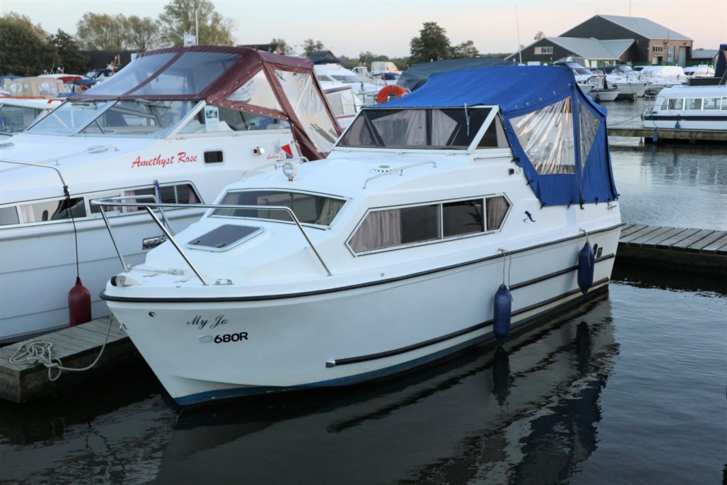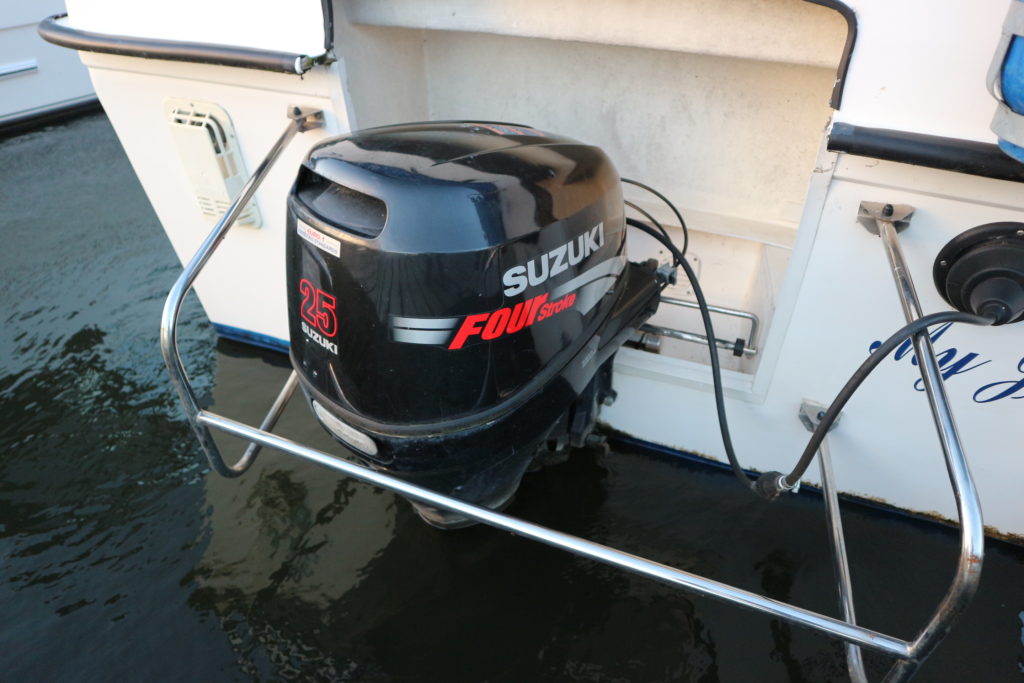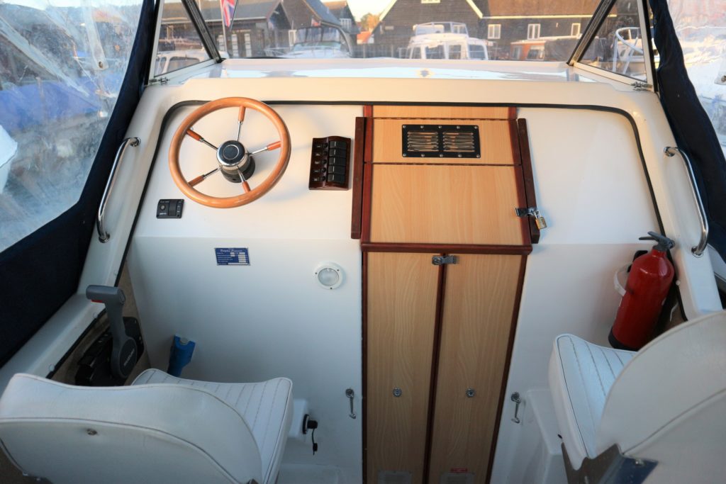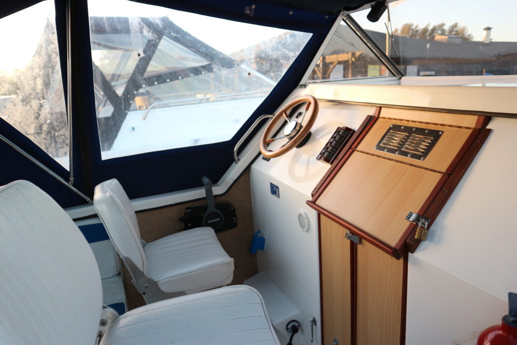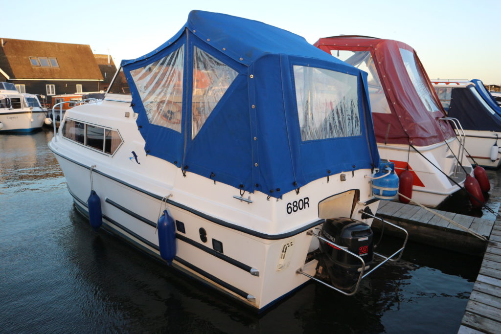 DOLPHIN 21 – 2008 – 25hp Suzuki outboard petrol engine. 4 berth accommodation with 1 x toilet to holding tank & shower. Galley with 4 burner hob, oven, grill & fridge. Specification including shore power, warm air heating, water heater, New BSC 11/22, folding canopy and screens for a low airdraft.