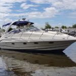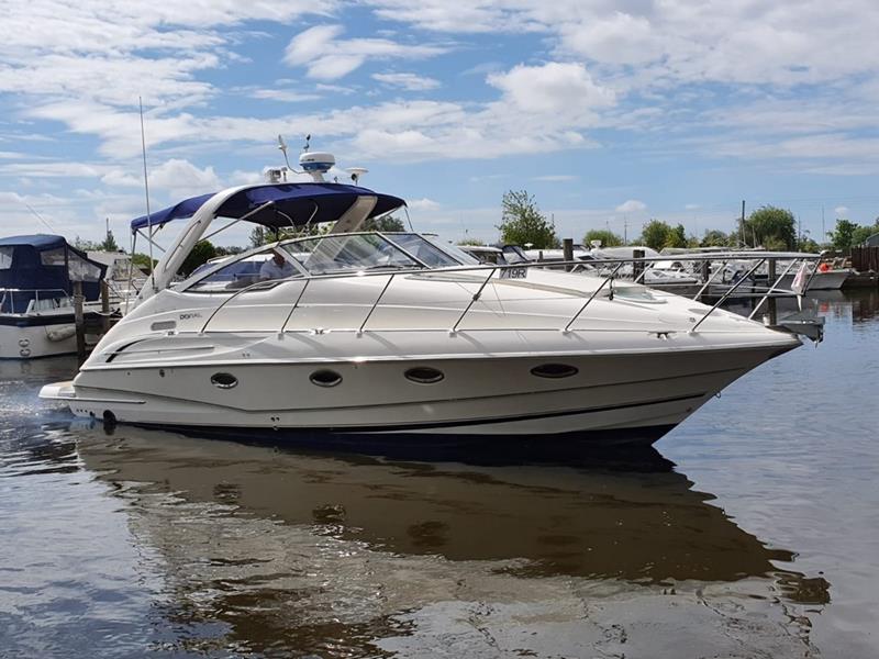 Doral Elegante – 2004 – Powered by twin Volvo KAMD300 285hp diesel engines through shafts. 5 berth accommodation with 1 x toilet and shower. Specification includes; Fisher Panda 4.5kva generator, Bowthruster, Stern thruster, Webasto warm air heating, holding tank, electric windlass, trim tabs, shore power and a range of navigation equipment including Furuno radar and Icom VHF, synthetic teak laid cockpit and bathing platform. A stylish, eye-catching shaft-driven sports cruiser with fantastic cockpit space, providing the perfect platform for cruising with family and friends.