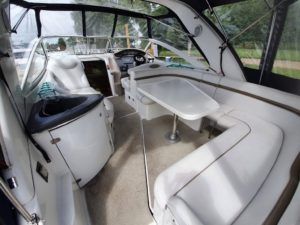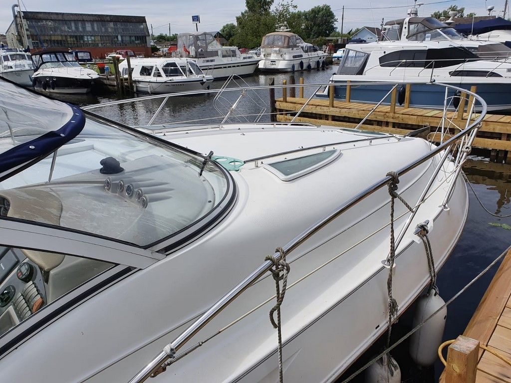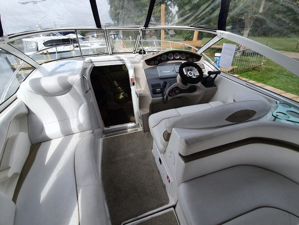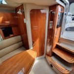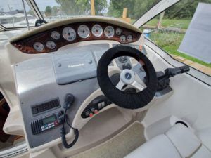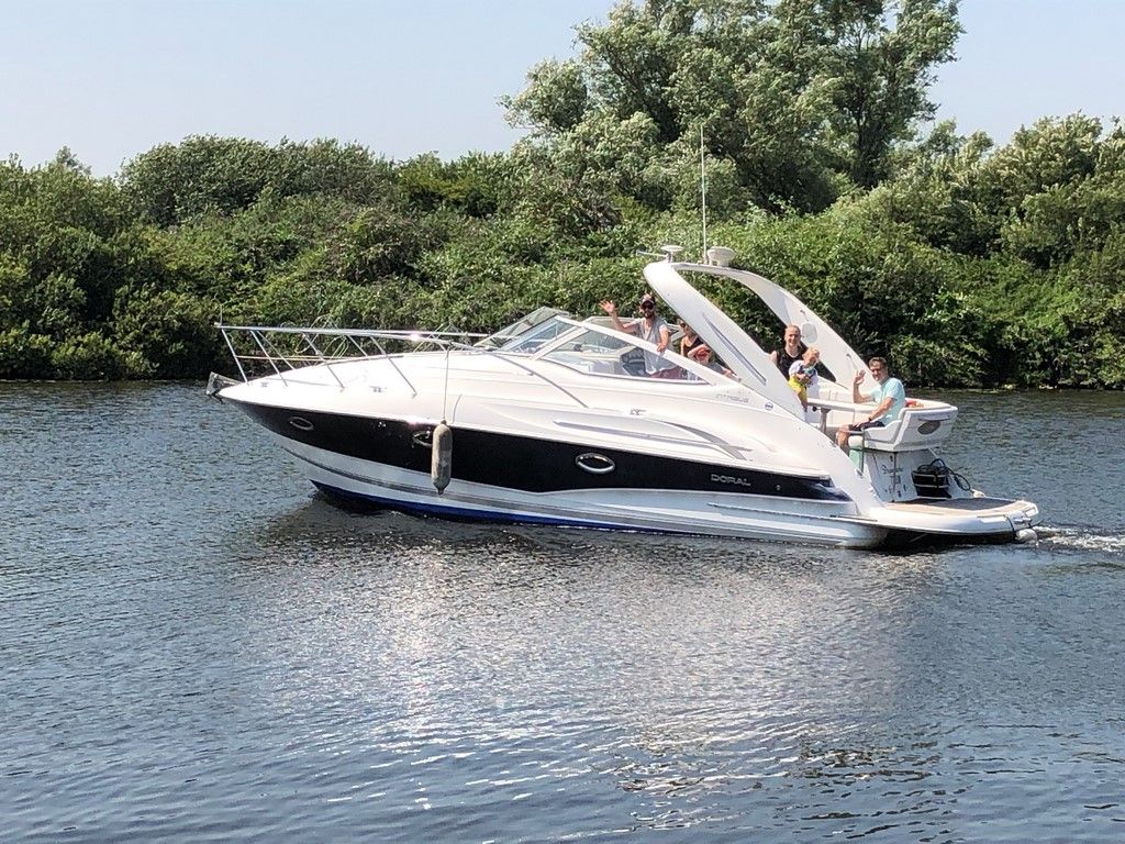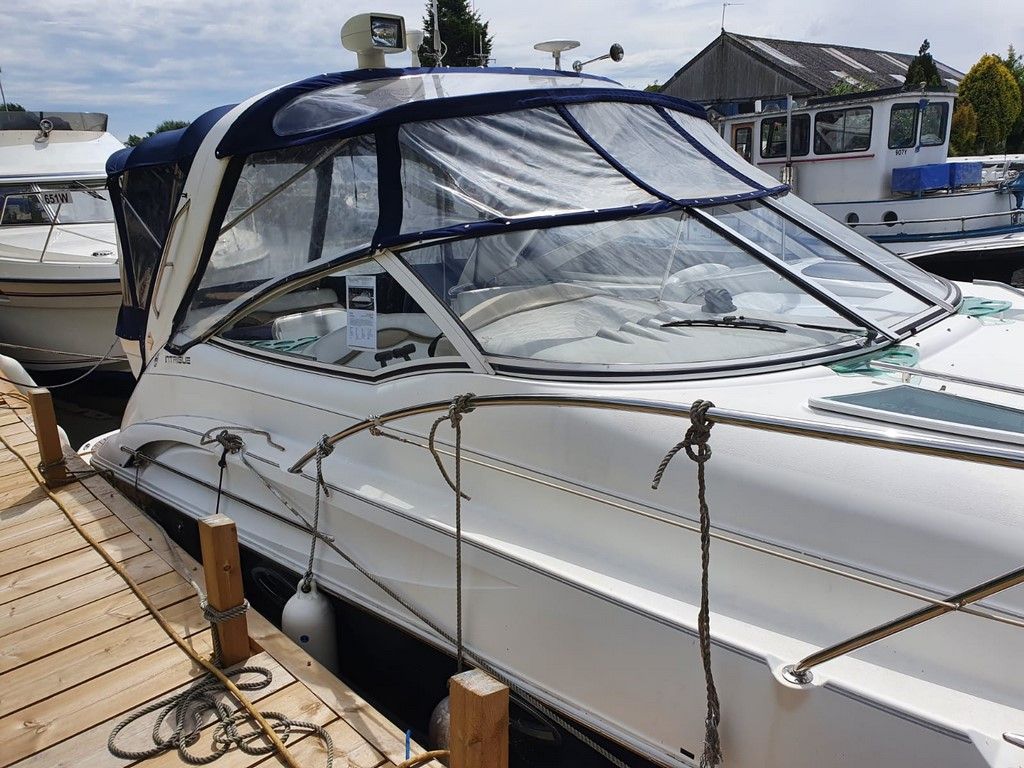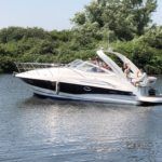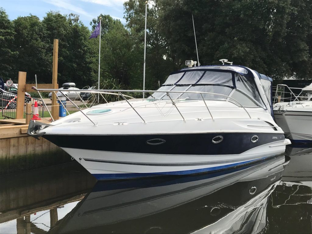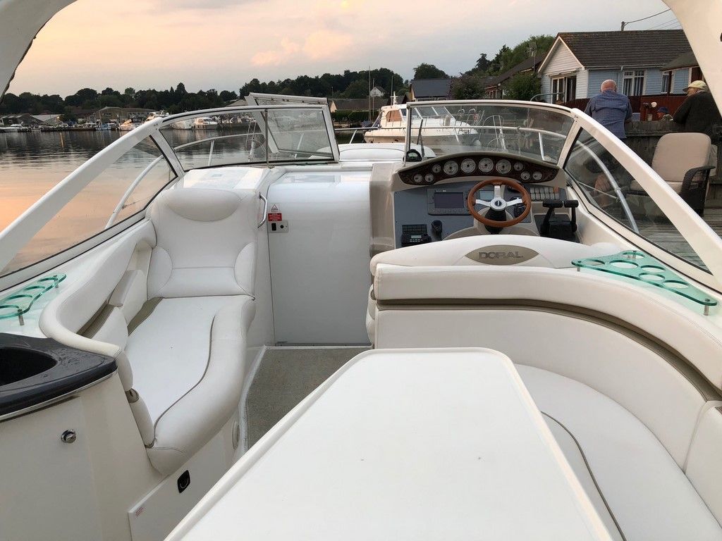 DORAL INTRIGUE – 2005 – Powered by twin Mercruiser 4.2l 230hp diesels through sterndrives. 4 berths in 1 open plan cabin with toilet and shower! Specification to include; Warm air heating, bpwthruster, folding radar arch for increased inland access, bowthruster, shore power, battery charger, Raymarine C80 chartplotter, electric windlass, VHF, holding tank and trim tabs. Lightly used with only 339 engine hours! Extended teak laid bathing platform and striking blue/white hull. A sociable sports cruiser with comfortable open plan accommodation!