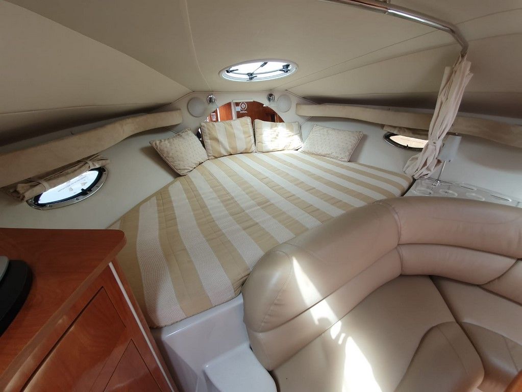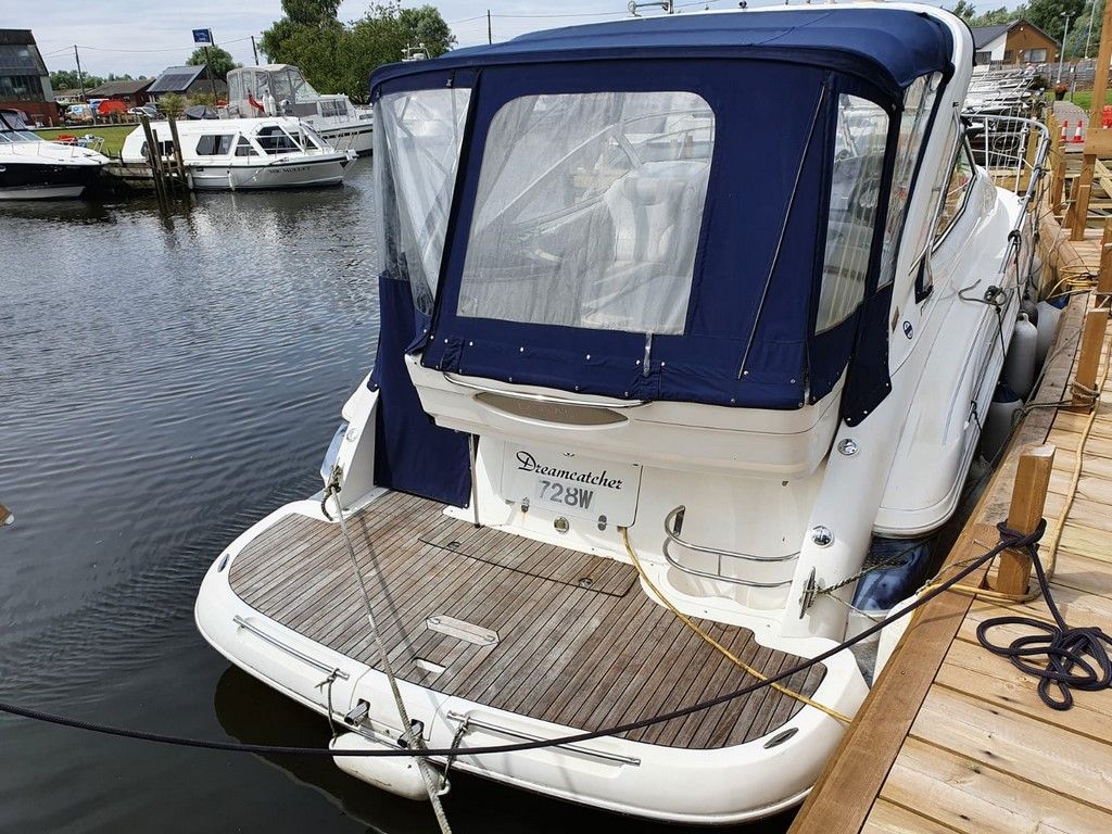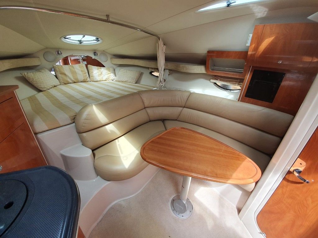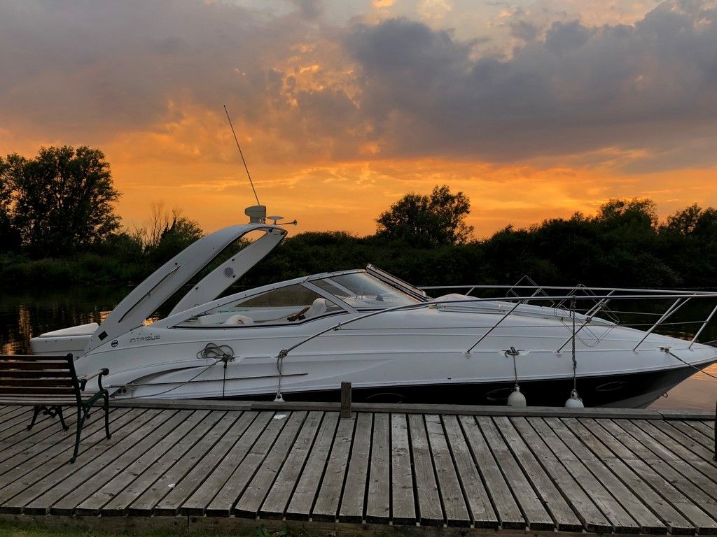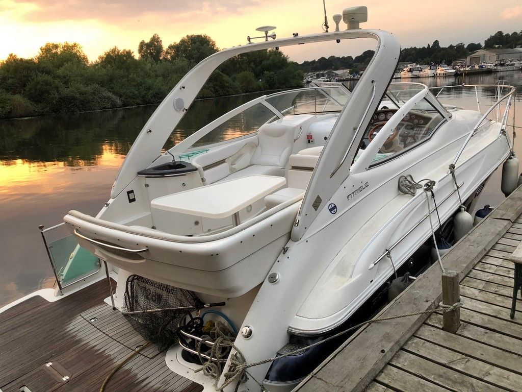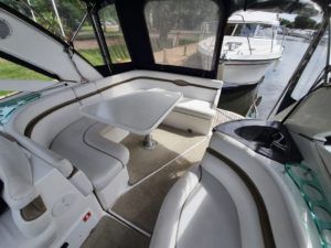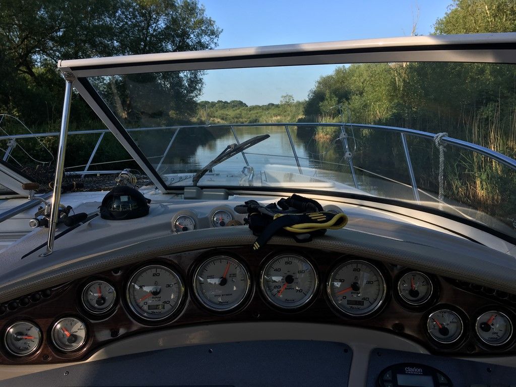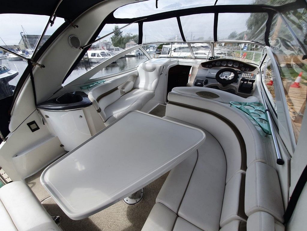 DORAL INTRIGUE – 2005 – Powered by twin Mercruiser 4.2l 230hp diesels through sterndrives. 4 berths in 1 open plan cabin with toilet and shower! Specification to include; Warm air heating, bpwthruster, folding radar arch for increased inland access, bowthruster, shore power, battery charger, Raymarine C80 chartplotter, electric windlass, VHF, holding tank and trim tabs. Lightly used with only 339 engine hours! Extended teak laid bathing platform and striking blue/white hull. A sociable sports cruiser with comfortable open plan accommodation!
