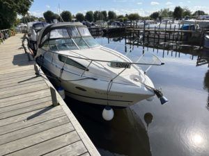 Doral Prestancia 280SE – 2004 – 2 x Mercruiser 1.7DTI 120hp diesel engines. 5 berth accommodation with a toilet and shower compartment. Specification to include; trim tabs, electric windlass, 240v shore power, Eberspacher heating, holding tank and macerator, battery charger, Navman GPS, extended teak bathing platform, folding arch and more. Antifouled and wintered ashore 2023. An eye-catching sports cruiser with a sociable cockpit and comfortable accommodation space.