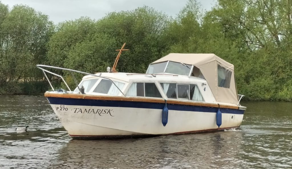 EASTWOOD 24 – circa 1975, single Vauxhall 60hp diesel engine. 4 berth accommodation. Specification to include , 2 burner cooker, oven and grill, warm air heating, hot water. A cruiser with low air draft allowing passage through Broadland bridges. Boat Safety Certificate expires September 2024.