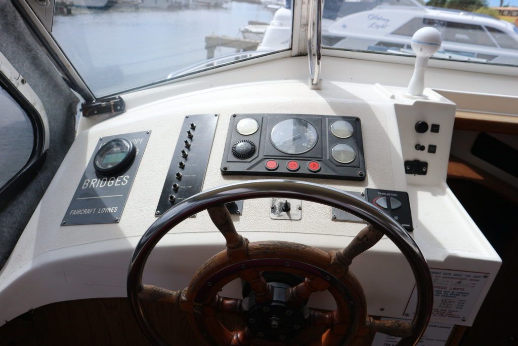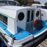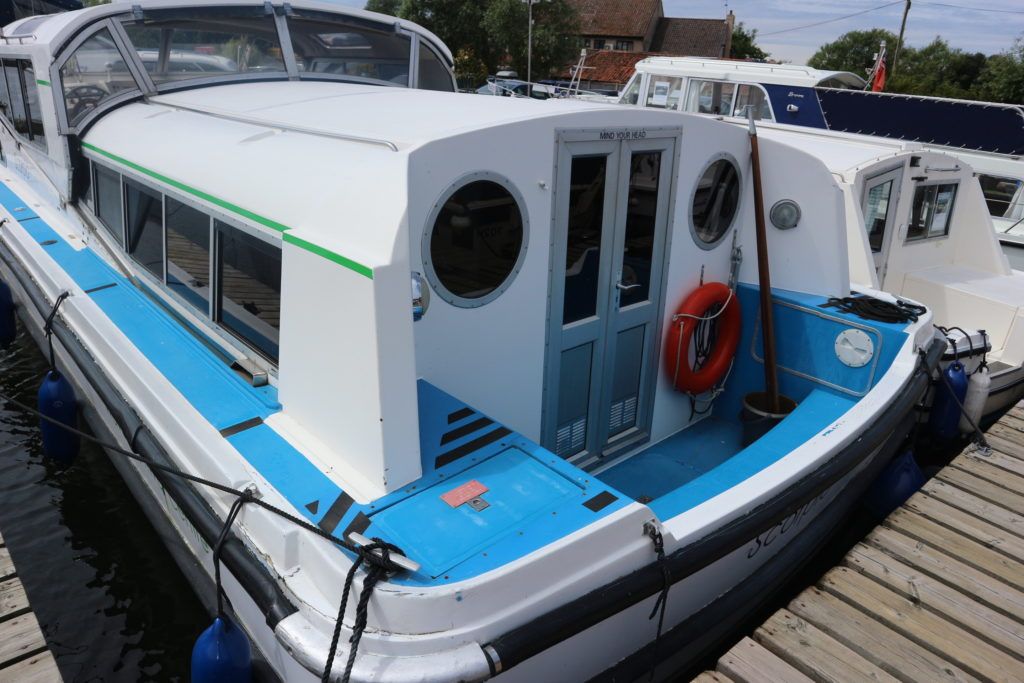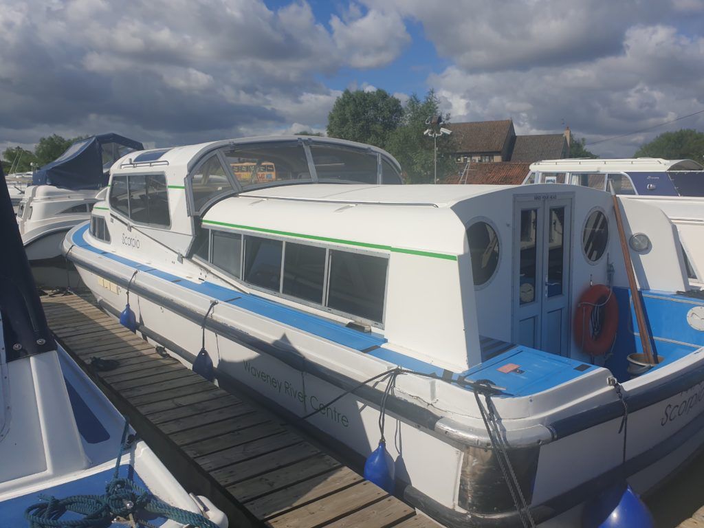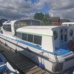 FAIR ENTREPRENEUR 35 – 1993 Single Perkins 35HP diesel engine. 6 berth accommodation in 3 separate cabins and saloon. Bow thruster , inverter, warm air heating, teak and holly flooring. Master en-suite cabin with island double berth and a further two single cabins astern. Large galley area with second toilet/shower compartment opposite. Fully sliding winch operated canopy over spacious saloon & large aft well. A spacious Broads cruiser with low air draft, offering comfortable and flexible accommodation.