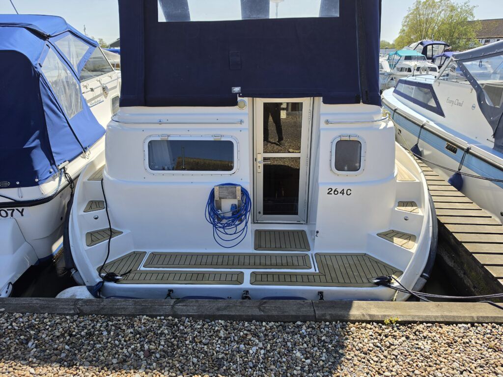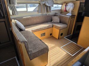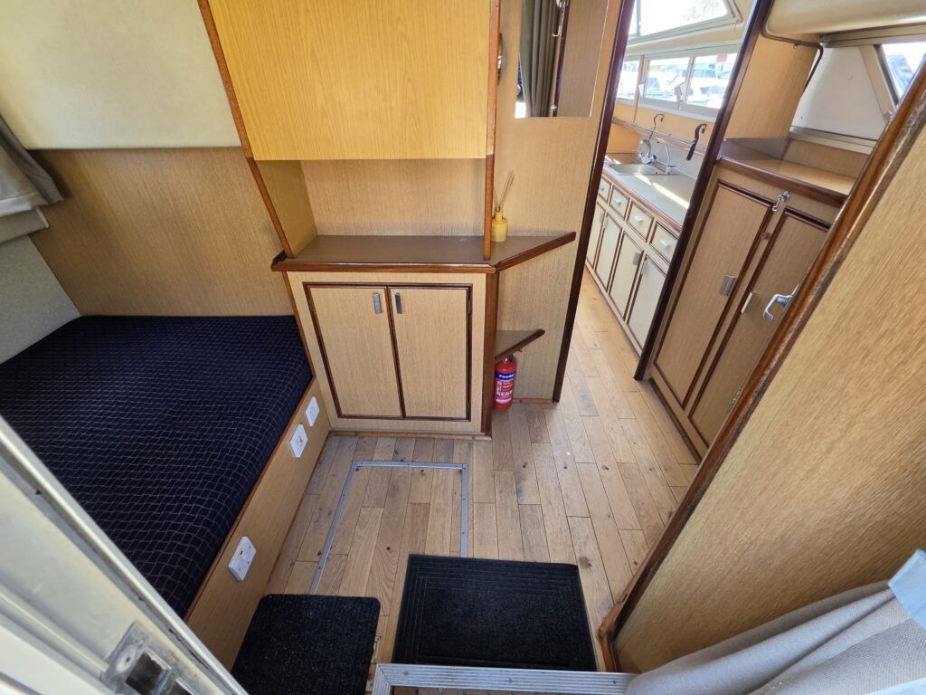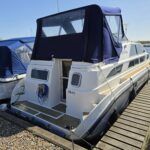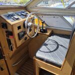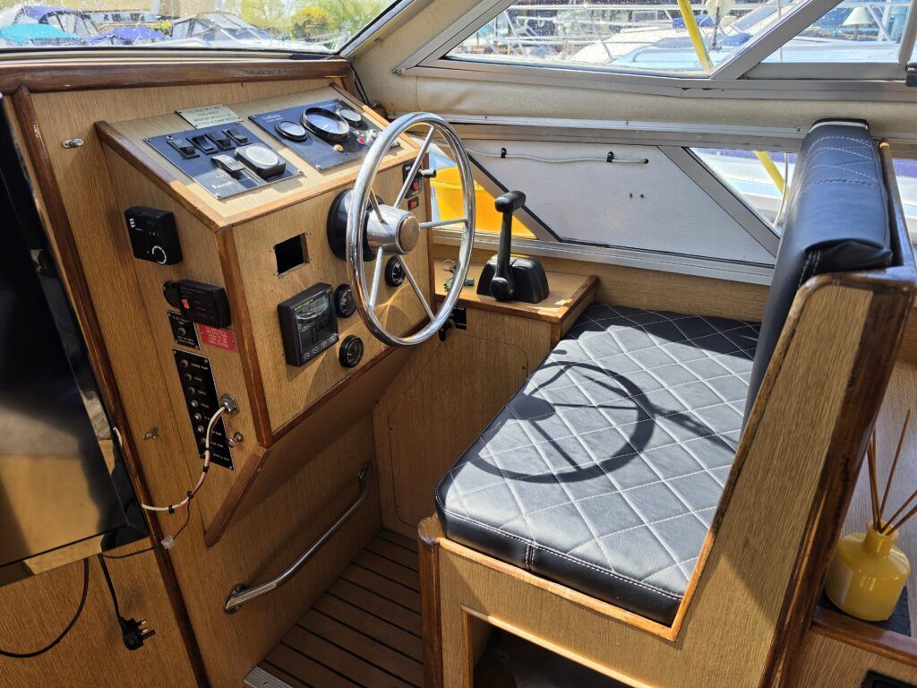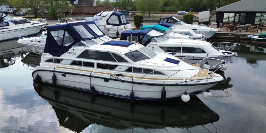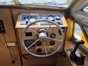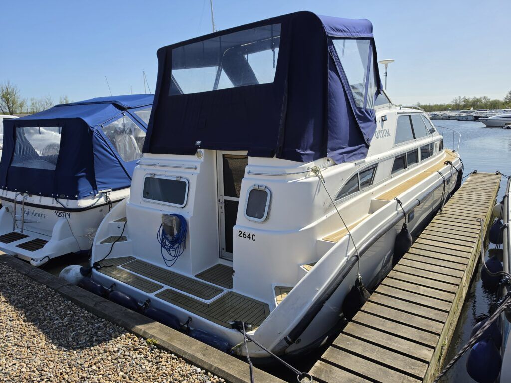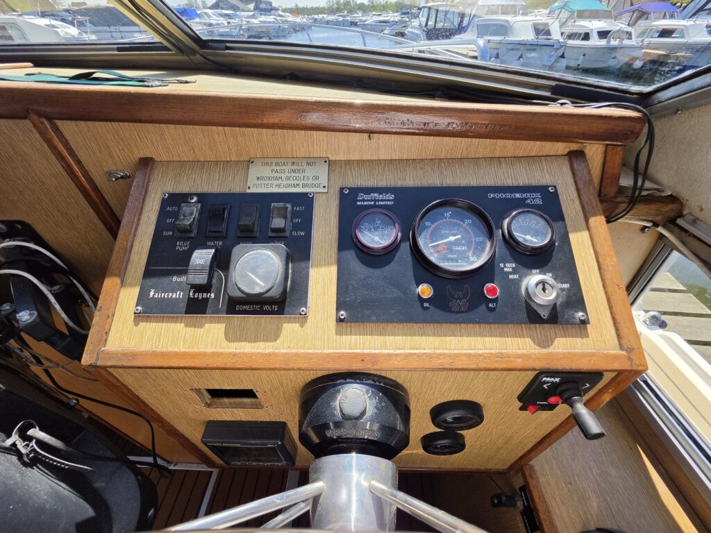 Faircraft 33 DC – 1996 – Powered by a Perkins 104-19 54hp diesel engine on shaft. 6 berth accommodation across 3 separate cabins with 2 toilet/shower compartments. Generous specification including bow thruster, shore power, battery charger, inverter, warm air heating, holding tank, immersion/calorifier, synthetic teak decks and cockpit, dual steering positions with upper deck seating and sun pad. Folding screens/canopy. Recent upholstery. BSC until 2027. Engine serviced March 2026. A practical and versatile river cruiser, ideal for family cruising or extended stays aboard, offering generous accommodation and easy aft access.