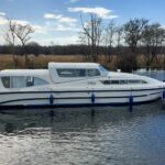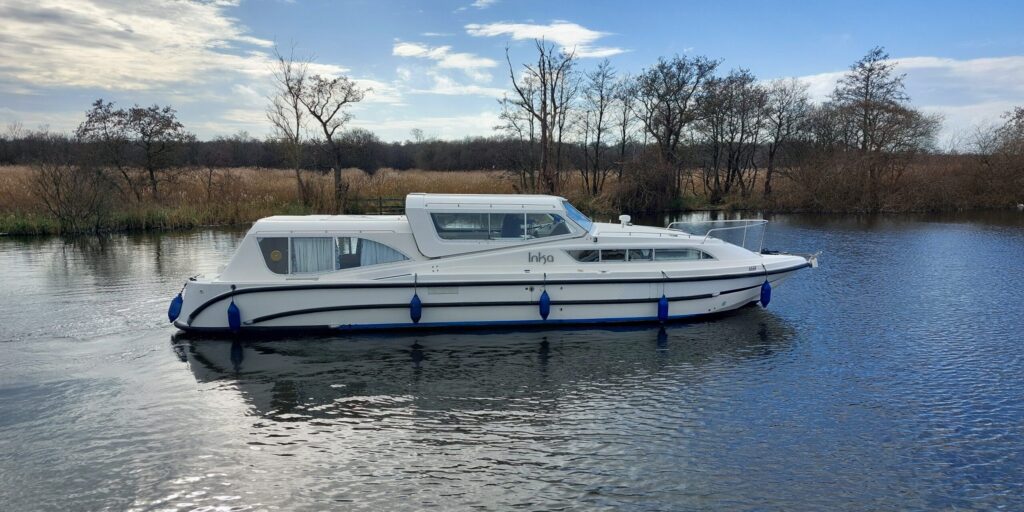 Faircraft 40 CC – 2001 – Single Perkins MC42 42hp diesel engine through a shaft drive. 8 berth accommodation with 2 toilet and shower compartments. Specification to include; bow-thruster, hydraulic sliding roof, electric windlass, warm air heating, inverter, battery charger. “Inka” benefits from having had a recent comprehensive internal ref-fit and some exterior improvements, including light adjustable name badges. She is a well cared for family craft, ideal for exploring the Broads or other inland waterways. BSC 01/01/27.