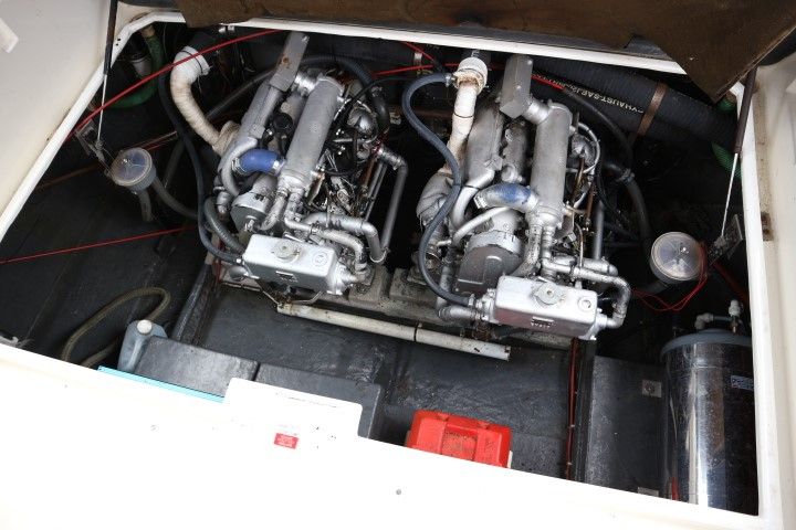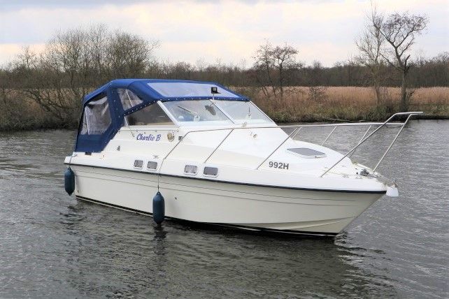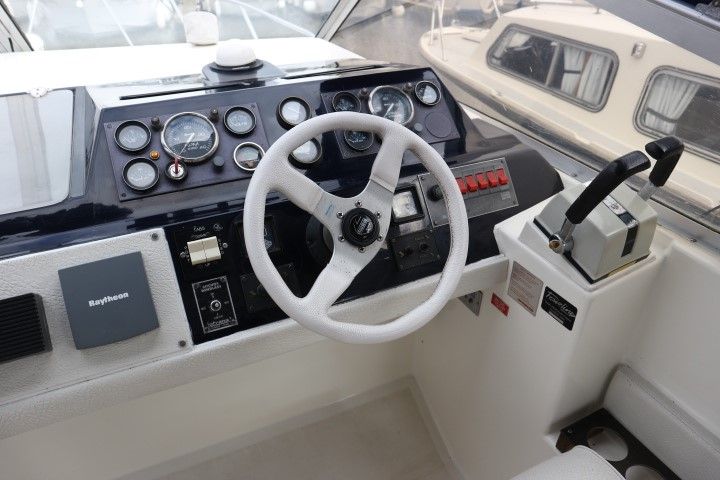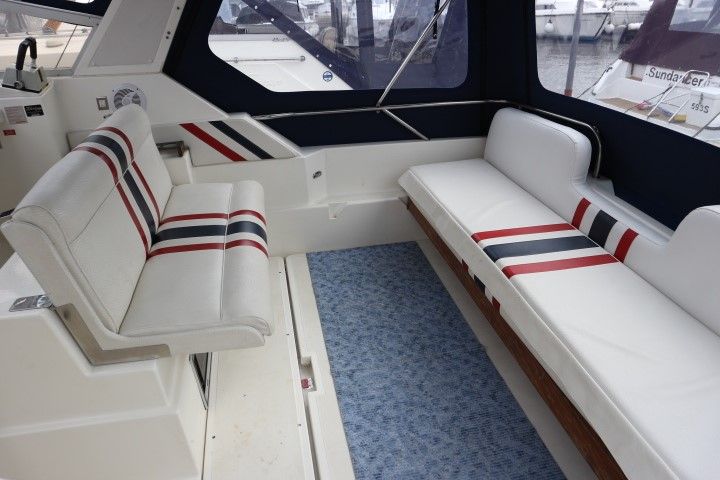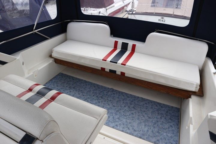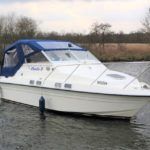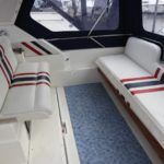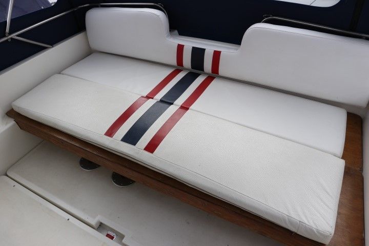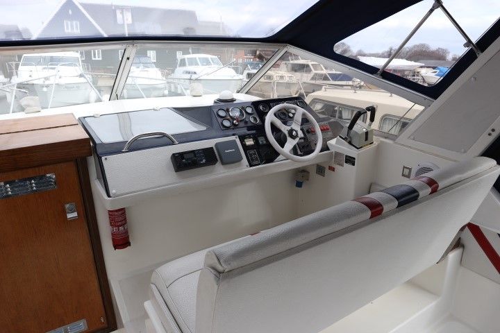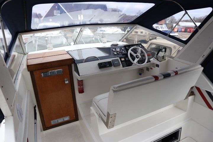 FAIRLINE 26 SUNFURY – 1989 with twin Peugeot 90HP diesel engines. 4 berths, sea toilet shower, two burner with oven and grill, fridge. battery charger, inverter, shore power, immersion, electric anchor winch, Apello VHF radio. New canopy fitted Feb 2018, new upholstery, interior woodwork professionally re finished, diesel engines fitted 2015, outdrives serviced 2015. An attractive sports cruiser with diesel economy.