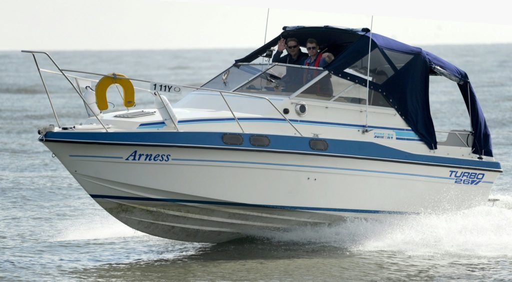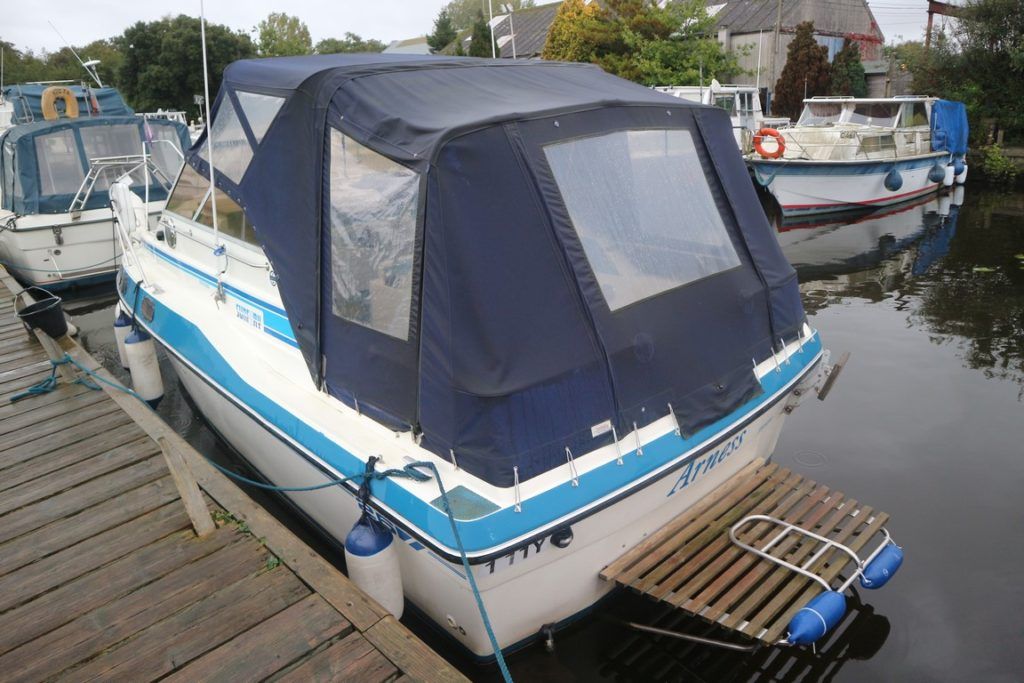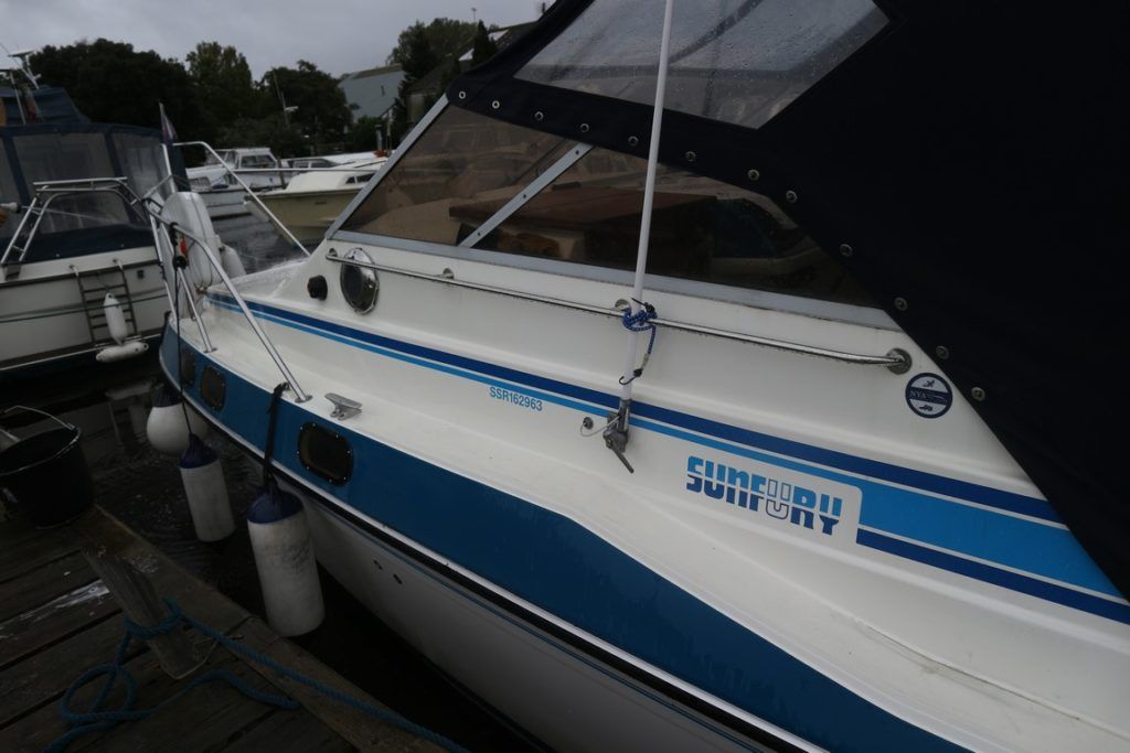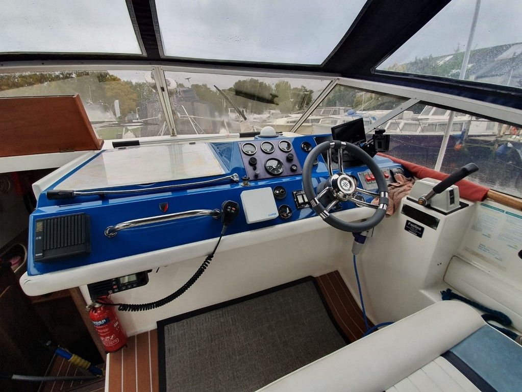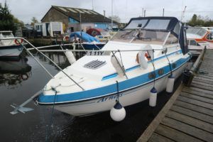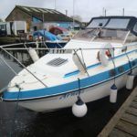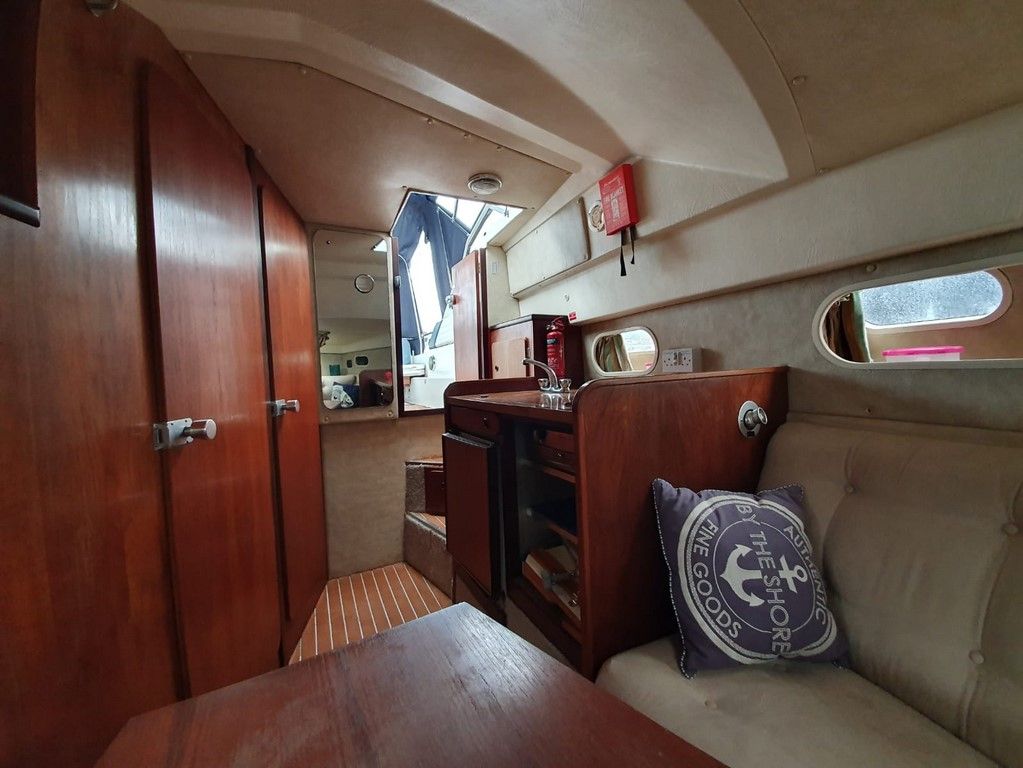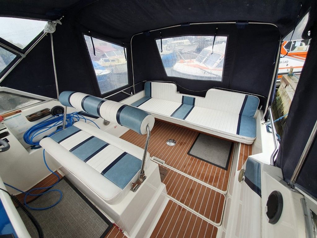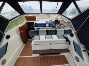 FAIRLINE 26 SUNFURY – 1983 – Single Volvo 165HP Diesel Engine. Four berths with one sea toilet and shower. Specification to include; Trim tabs, VHF, calorifier and shore power with battery charger and immersion heater. Folding canopy framework for increased inland access. Recent teak deck effect flooring covering throughout. Single diesel economy. A superb introduction to offshore cruising.