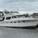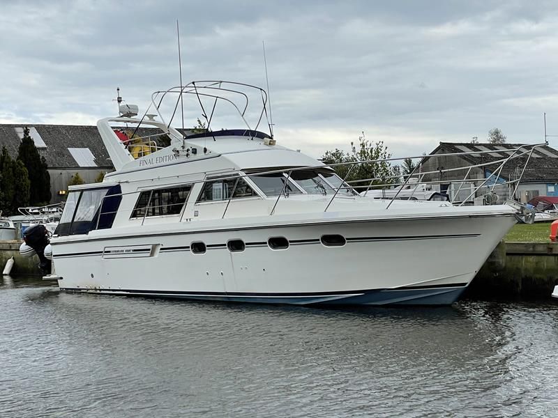 FAIRLINE 40 – 1989 – Powered by twin Volvo TAMD61A 306hp diesels through shafts – 8 berth accommodation made up of an en suite master cabin, second twin cabin, make up double in the saloon and a twin crew cabin! Specification to include; Bowthruster, electric windlass with deck and helm controls, warm air heating, trim tabs, shore power with 240v sockets, battery charger and immersion, Raytheon SL70, VHF, Raychart. A cavernous flybridge boat, perfect for those looking to complete extended offshore cruising! Current vendor has started to re-fit and upgrade and with a some further time and investment from a new owner it could make a fine example.