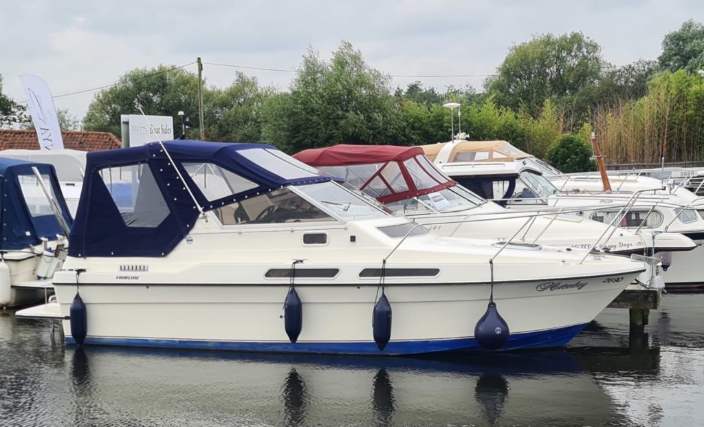 Fairline Carrera – Circa. 1989 – Powered by twin Volvo AQ151 146hp petrols. 4 berth accommodation with one sea toilet and one shower. Specification includes, Electric windlass, Trim tabs and shore power supply with immersion. Recent full machine compound and polish, hull antifoul, new carpets and interior upholstery all in 2020, new head on port engine fitted 2021. An exceptional example. NYA STOCK – 3 Month engine and gearbox warranty.