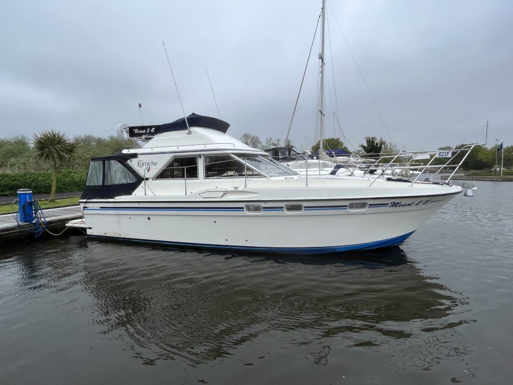 FAIRLINE CORNICHE 31 – 1986 – 2x Volvo TAMD30A 110HP shaft driven diesel engines (Serviced March ’23) – 5 berth accommodation with a sociable dinette layout and a toilet/shower compartment. Specification to include; Warm air heating, Bow thruster, Furuno GPS, VHF, Furuno radar (to be connected), holding tank, and transom door offering excellent stern access. BSC 2026, River toll 23/24 paid. A well-presented example, serviced and ready to go for the season!