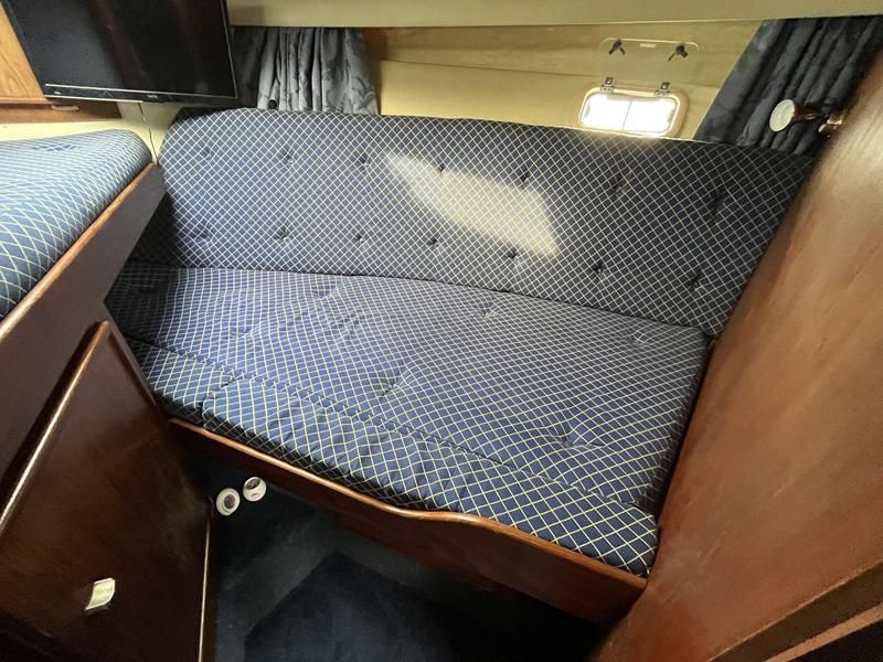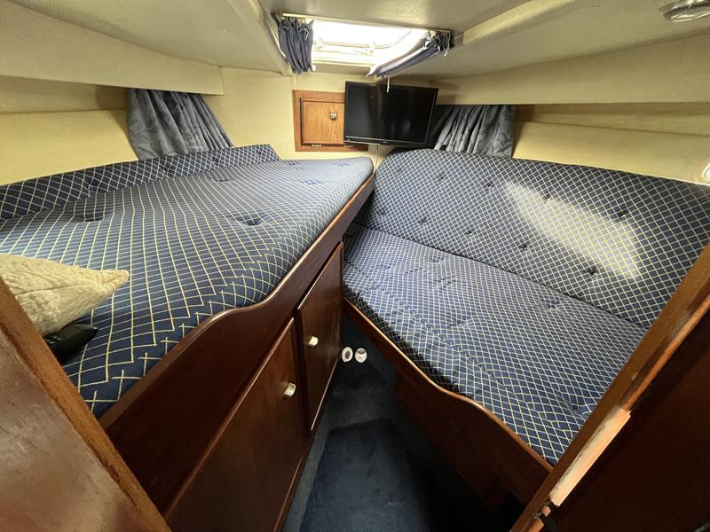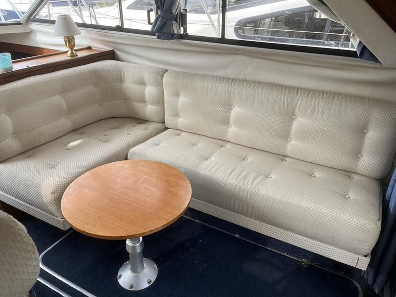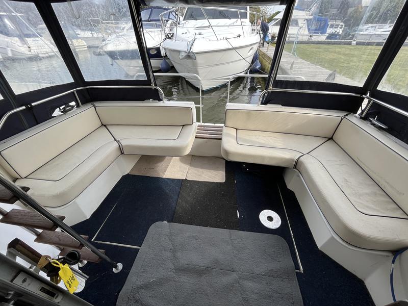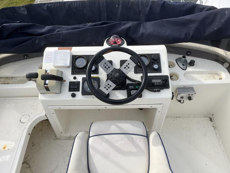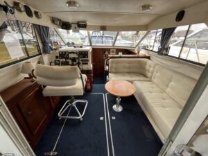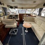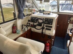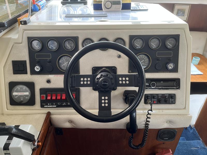 Fairline Corniche 31 – 1986 – 2x Volvo TAMD30A 110hp shaft-driven diesel engines. 5 berth accommodation with a sociable dinette layout and a toilet/shower compartment. Specification to include; Warm air heating, Bow thruster, Furuno GPS, VHF, shore power, battery charger (2024), radar, holding tank, and transom door offering excellent stern access. BSC 2026. Engines serviced Nov 24. Antifouled Feb 25. A well presented example of this sought-after shaft-driven flybridge cruiser. Fully serviced and ready for its next owner to enjoy.