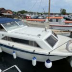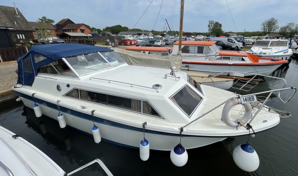 Fairline Mirage 29 – 1985 – twin Volvo Penta AQAD30A on outdrives, 5 berth, shore power, inverter, warm air heating, immersion heater, trim tabs, battery charger, antifouled may 2022, outdrives may 2022, Canopy with folding screens for a much reduced air draft and increased inland access! Comfortable accommodation and generous cockpit for a boat of 29ft!
