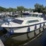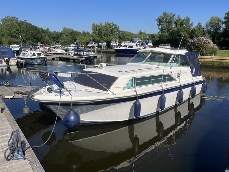 FAIRLINE MIRAGE 29 – Circa 1980 – 2 x Volvo 140A petrol engines (serviced April 23). 5 berth accommodation over two cabins with a toilet and shower compartment. Major re-fit including new galley, walnut burr laminate and LED lighting throughout. Well specified including; Eberspacher warm air heating, Vetus bow thruster, 240V shore power with battery charger, Calorifer, Waeco wine fridge, Waeco refrigerator, Fusion stereo system, Autohelm tridata, spare canopy, spotlight, anchor winch and many extras. BSC 2026. A striking Fairline Mirage, well maintained with an impressive refurbishment and a host of desirable features.