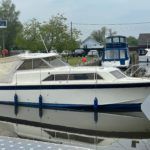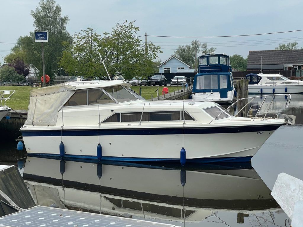 FAIRLINE MIRAGE – Circa 1980 – Powered by twin Volvo AQ145A 145hp petrols through sterndrives – 5 berth accommodation with toilet and shower facility – Specification to include; warm air heating, holding tank, engine instrumentation, shore power, trim tabs, 240v sockets, 12v sockets! Current canopy in very poor condition but new one on order by current owner. in current ownership for 20 years and used to cruise the Norfolk Broads.