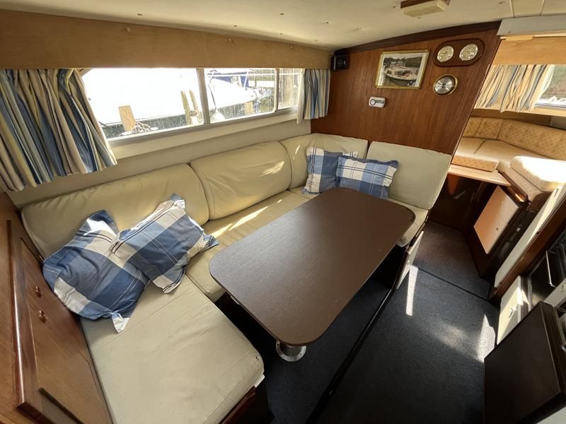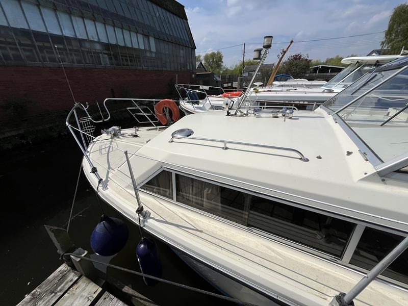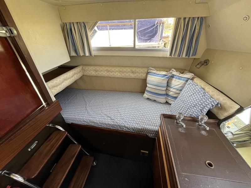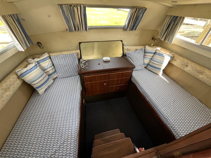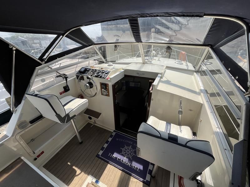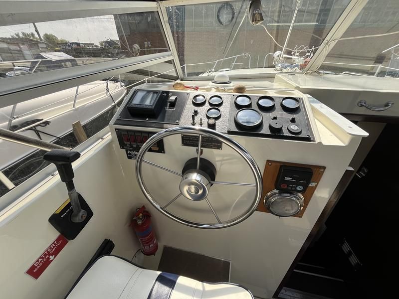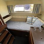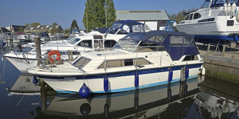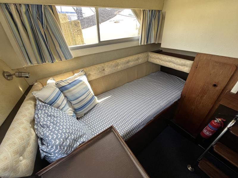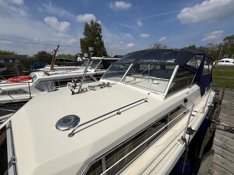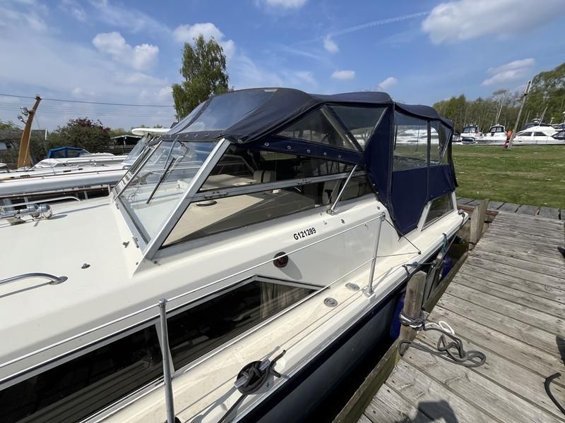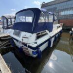 Fairline Mirage 29 Aft Cabin – Circa 1982 – Powered by a single Volvo MD31A 60hp diesel through a shaft. 6 berth accommodation across two cabins with 1 x toilet & shower. Specification including bowthruster, warm air heating, electric toilet to holding tank, shore power battery charger. BSC 03/26. Folding screens and canopy significantly reducing the air draft for increased inland access. An ideal vessel for extended inland cruising offering single diesel economy and sought after shaft configuration.